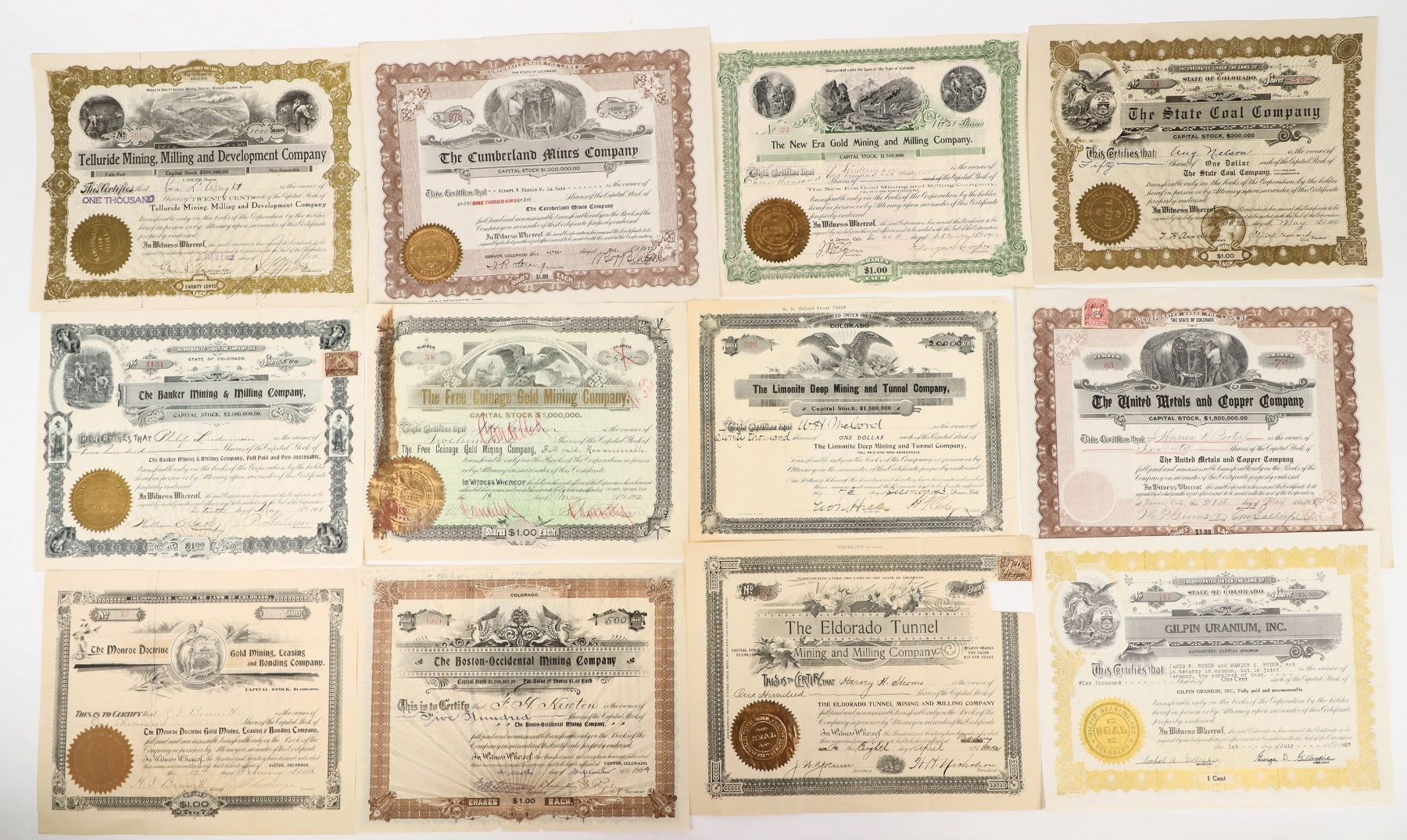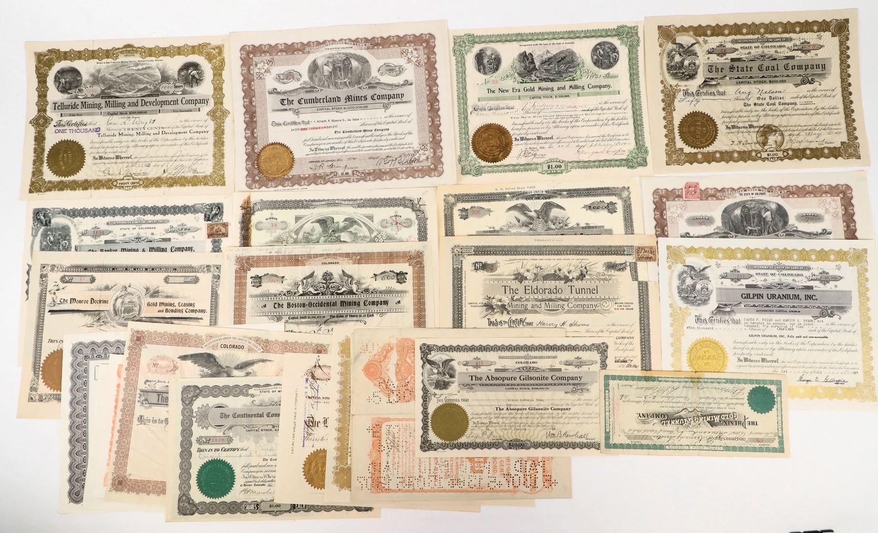 Lot of 22 pieces, only one duplicate. 1892-1957. Includes: Continental Cons. MC; Leon Cons. MC; Carrie S. GMC; Hidden Fortune GMC bond; United Metals & Copper Co.; Gilpin Uranium Inc.; State Coal Co.; Eldorado Tunnel Mining & Milling Co.; Limonite Deep Mining & Tunnel Co.; Phenix Gold Mining & Tunnel Co.; Absopure Gilsonite Co.; Trabella Uranium Mines; Crusader Oil & Uranium Co.; Lincoln Boy Mining & Tunneling Co.; Boston-Occidental MC; and others.