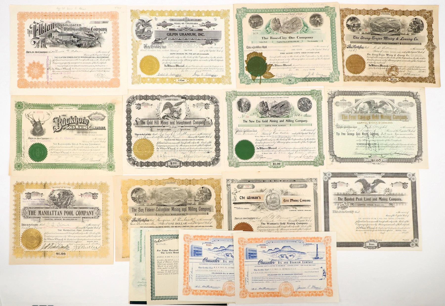 Lot of 17. U/U, I/U,I/C. "The Gold Hill Mines and Investment Co. (A.T.) " issued 1908 Other company I.E; The Elkton Consolidated Mining and Milling Co. issued 1914. The Buckhorn Gold Mining Co. issued 1900., The Phenix Gold Mining & Tunnel Co. issued 1896. The Woman's Gold Mining Co. issued 1899, The Canon City and Cripple Creek Electric Railway Co. Bond w/all coupons. , issued 1897.. And more. All VG or better cond.