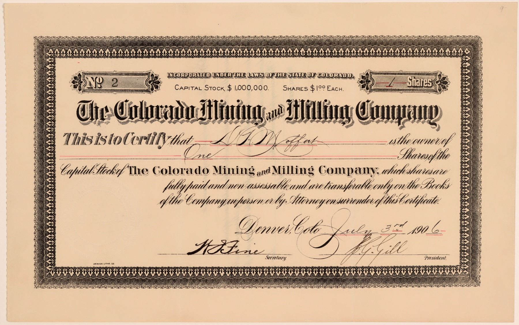Great certificate. Issued to D.H. Moffat. Since this in certificate # 2, one would suspect Moffat was at least part owner. Simple. Excellent condition - no edge, corner, discoloration or pin hole issues. Signed by secretary Fine and president GIll. Dateline Denver July 3, 1906. City: Cripple Creek State: Colorado Date: 1906