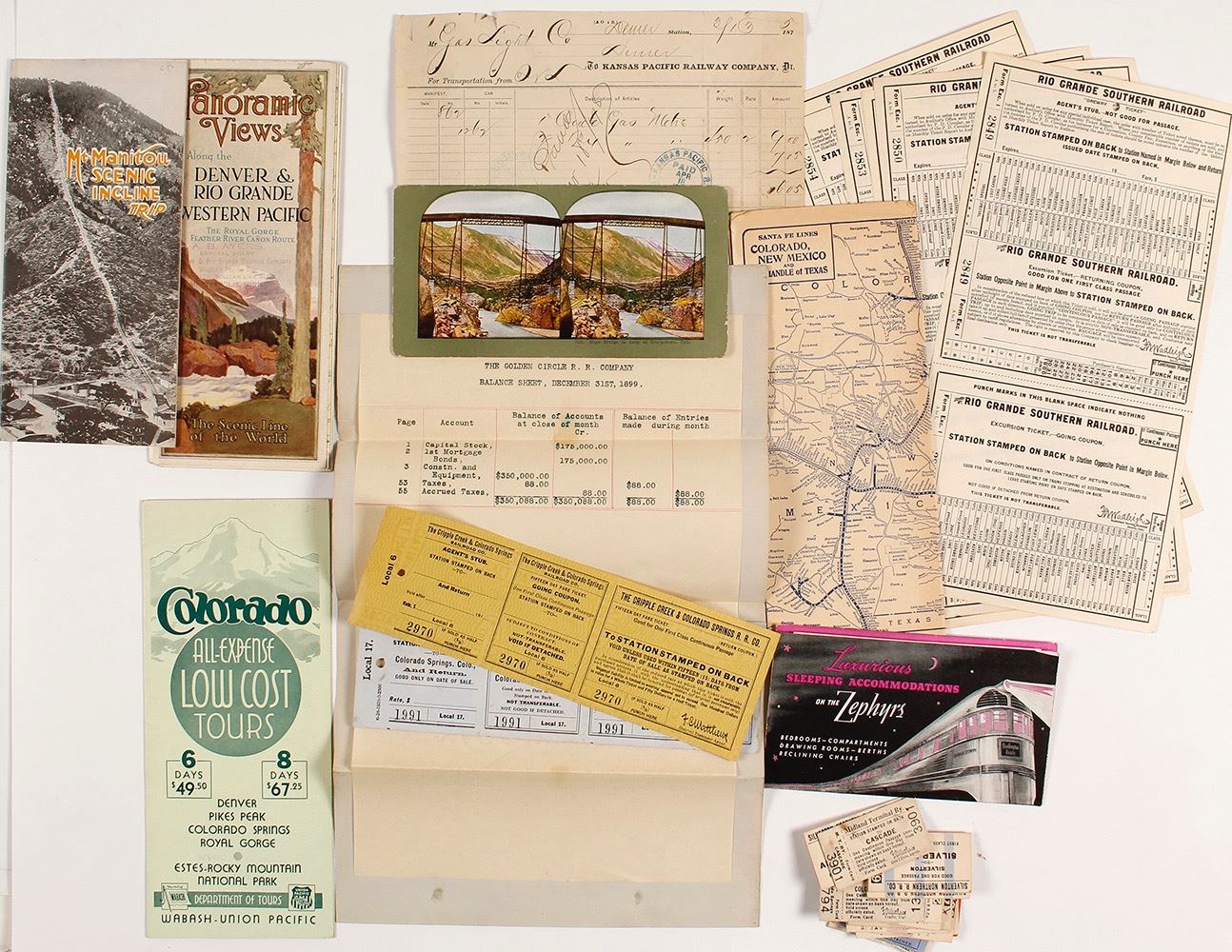 Lot of 34. Includes: Panoramic Views along the Denver & Rio Grande Western Pacific, brochure with map and color lithos, undated; Mt. Manitou Scenic Incline Trip brochure, undated; c.1936 Union Pacific brochure; 16 Silverton Northern R.R. Co. and 2 Midland Terminal Railway cardboard tickets; Cripple Creek & Colorado Springs R.R. unused 15-day ticket, c.1910s; Midland Terminal Railway Sunday Only Excursion ticket; Kansas Pacific Railway billhead to Denver Gas Light Co., 1875; Golden Circle Railroad Co. balance sheet, 1899, Denver; six unused tickets for the Rio Grande Southern Railroad; 1937 pamphlet for the Denver Zephyrs; Santa Fe Lines map & timetable; and Georgetown loop color stereoview. (Prag Collection) Date: Location: Colorado HWAC # 55641