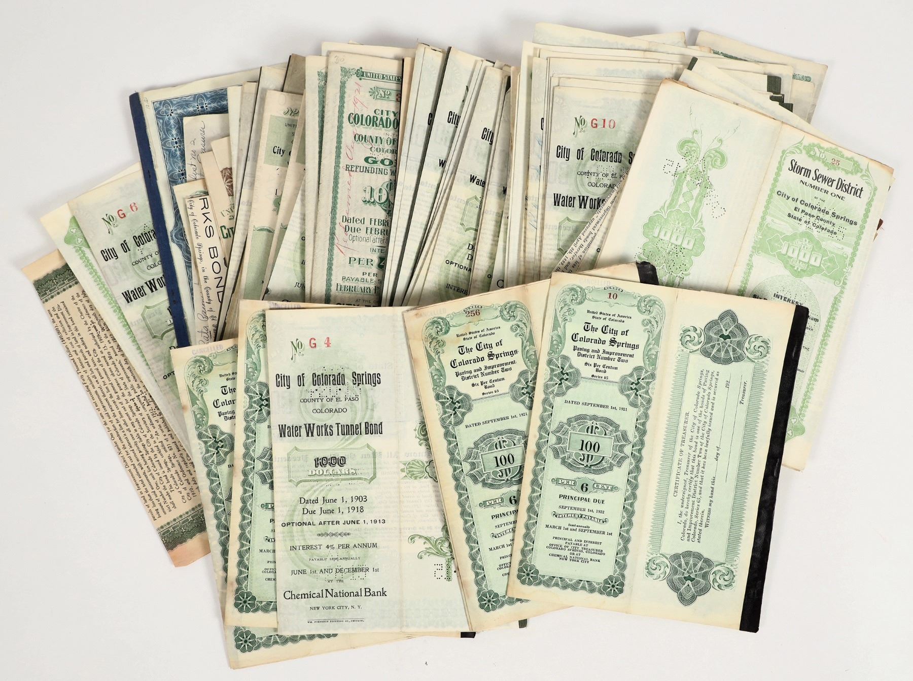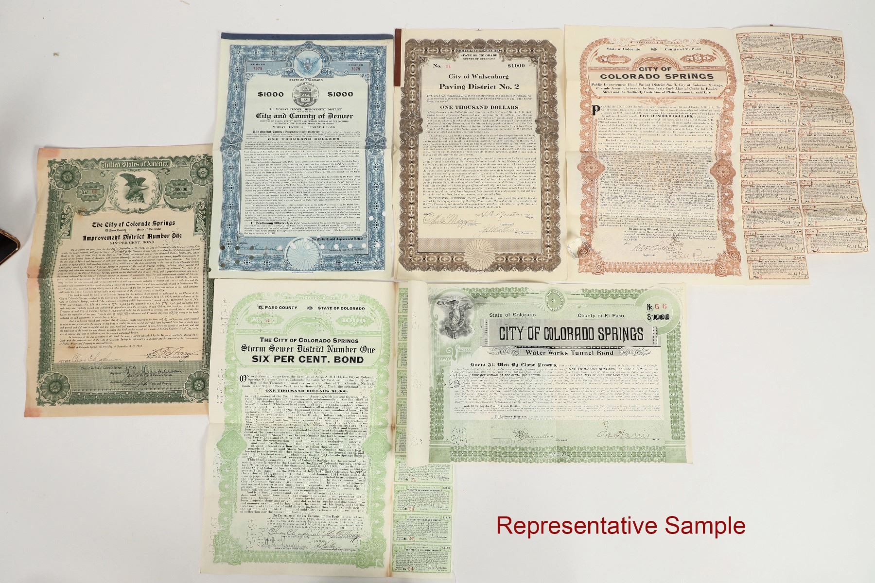 Colorado Springs Bonds Early 1900s About 100. Multiple varieties. Mostly water works, paving and improvement type of bonds, with reservoir, storm sewage, tunnel, refunding, city judgement, etc. Eclectic group, mostly c1910-1915, with coupons, stamps, signatures, et.al.