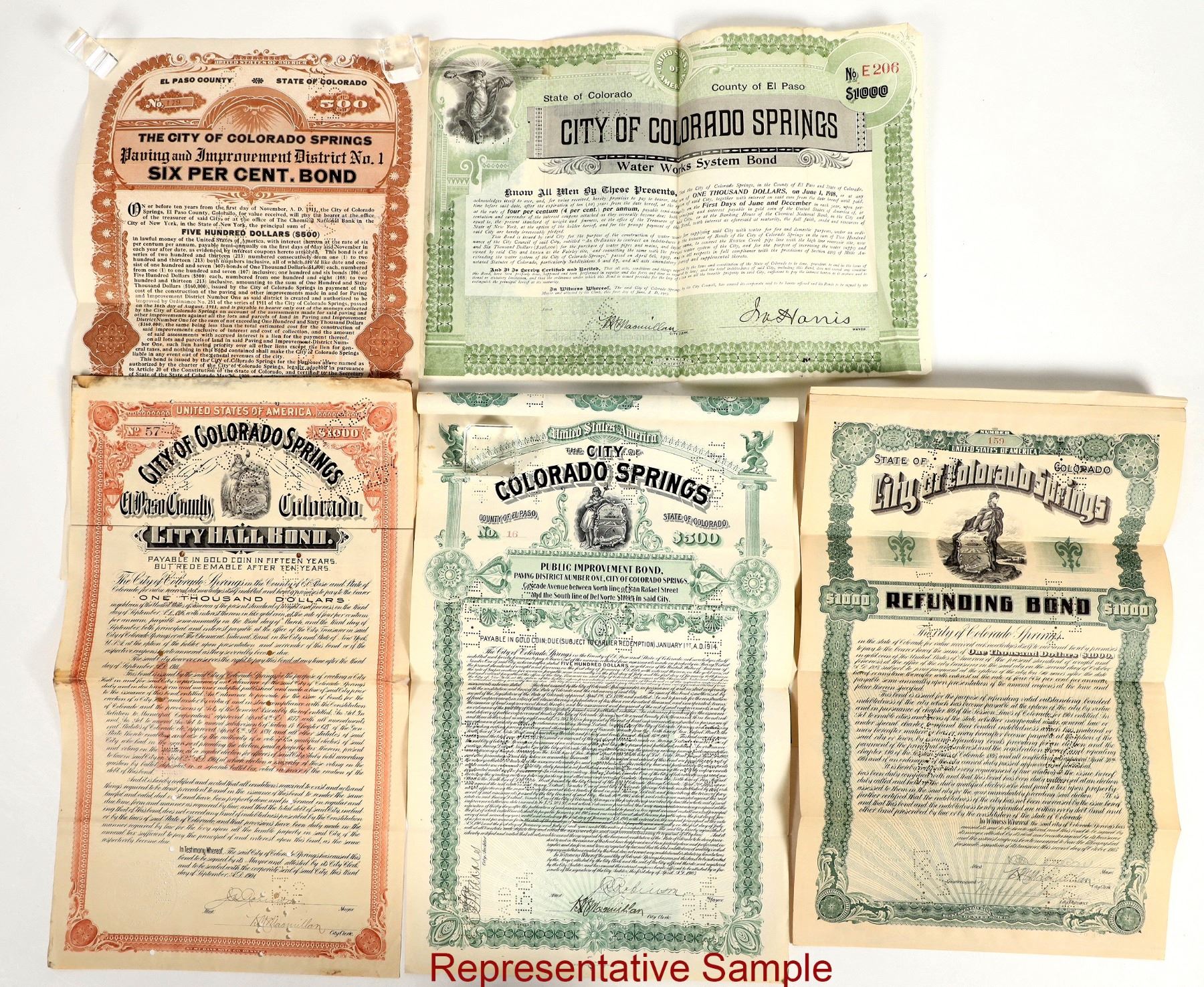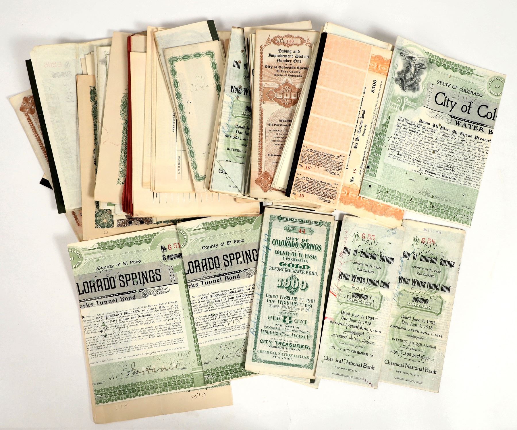 Colorado Springs Bonds Early 1900s About 100. Multiple varieties. Mostly water works, paving and improvement type of bonds, with reservoir, storm sewage, tunnel, refunding, city judgement, etc. Eclectic group, mostly c1910-1915, with coupons, stamps, signatures, et.al.