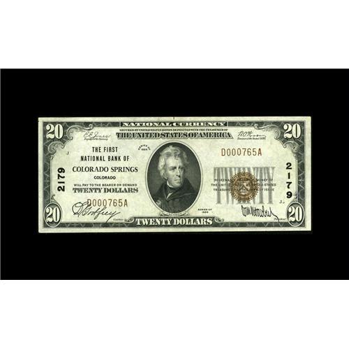 <B>Colorado Springs, CO</B></I> - $20 1929 Ty. 1 <B>The First NB</B></I> Ch. # 2179<BR>An <B>Extremely Fine+</B></I> note from the headquarters city of the American Numismatic Association. Well margined, bright and crisp.