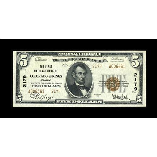 <B>Colorado Springs, CO</B></I> - $5 1929 Ty. 2 <B>The First NB</B></I> Ch. # 2179<BR>Only four of the roughly 70 1929 notes documented from here are of this type and denomination. Tonight's <B>About Uncirculated</B></I> offering is by far the nicest. From the headquarters city of the American Numismatic Association.<BR><BR><b>Shipping:</b> Coin/Currency (<a target="_blank" href="http://www.heritageauctions.com/common/shipping.php">view shipping information</a>)
