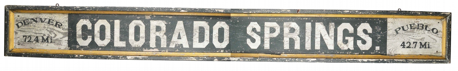 Colorado Springs Wood Sign. Directional with Denver being 72.4 miles and Pueblo 42.7 miles. Very Good Original Condition with a lot of asthetic value. 104 X 12 Inches.