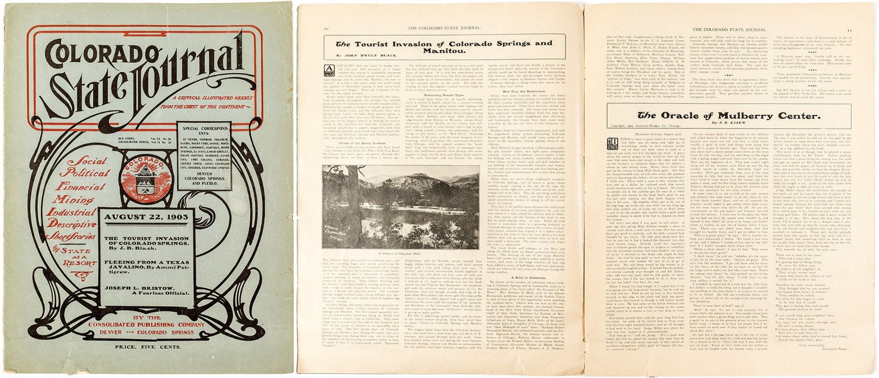 Includes: Indian Duel, Women's news, Oracle of Mulberry Center, Tourist Invasion of Colorado Springs, Mining & financial, chauffeurs and wheelmen, Pueblo Observations, Political News, etc. Only a view pictures? 15 x 11". 26 pages plus three pages of advertising. Cover has several rips and some small tears. There is a one inch tear on the bottom that goes through all the pages. Date: 1903 Location: Colorado HWAC # 40572