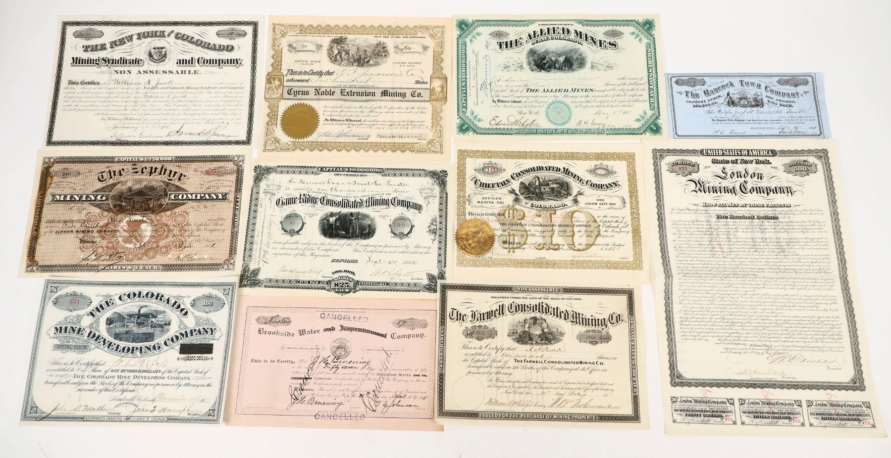 Early Colorado Stocks c.1870-1905 This is the good stuff. Includes: London Mining Company, Brookside Water and Improvement Company, Chieftain Consolidated Mining Company, Allied Mines of Ouray, Colorado, Farwell Consolidated Mining Company, Hancock Town Company, Zephyr Mining Company, Cyrus Nobel Extension Mining Co., Colorado Mine Development Company, Game Ridge Consolidated Mining Company, New York and Colorado Mining Syndicate and Company. Nice group. See photo.