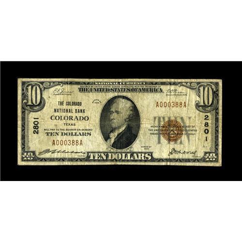 <B>Colorado, TX</B></I> - $10 1929 Ty. 1 <B>The Colorado NB</B></I> Ch. # 2801<BR>A neat "two state" bank which is considerably scarcer in small size than large, with even the massive Irish collection lacking any small note from here. This piece was obtained from our January, 2003 offering of the Jeff Poyer collection. <B>Fine.</B></I><BR><BR><b>Shipping:</b> Coin/Currency (<a target="_blank" href="http://www.heritageauctions.com/common/shipping.php">view shipping information</a>)