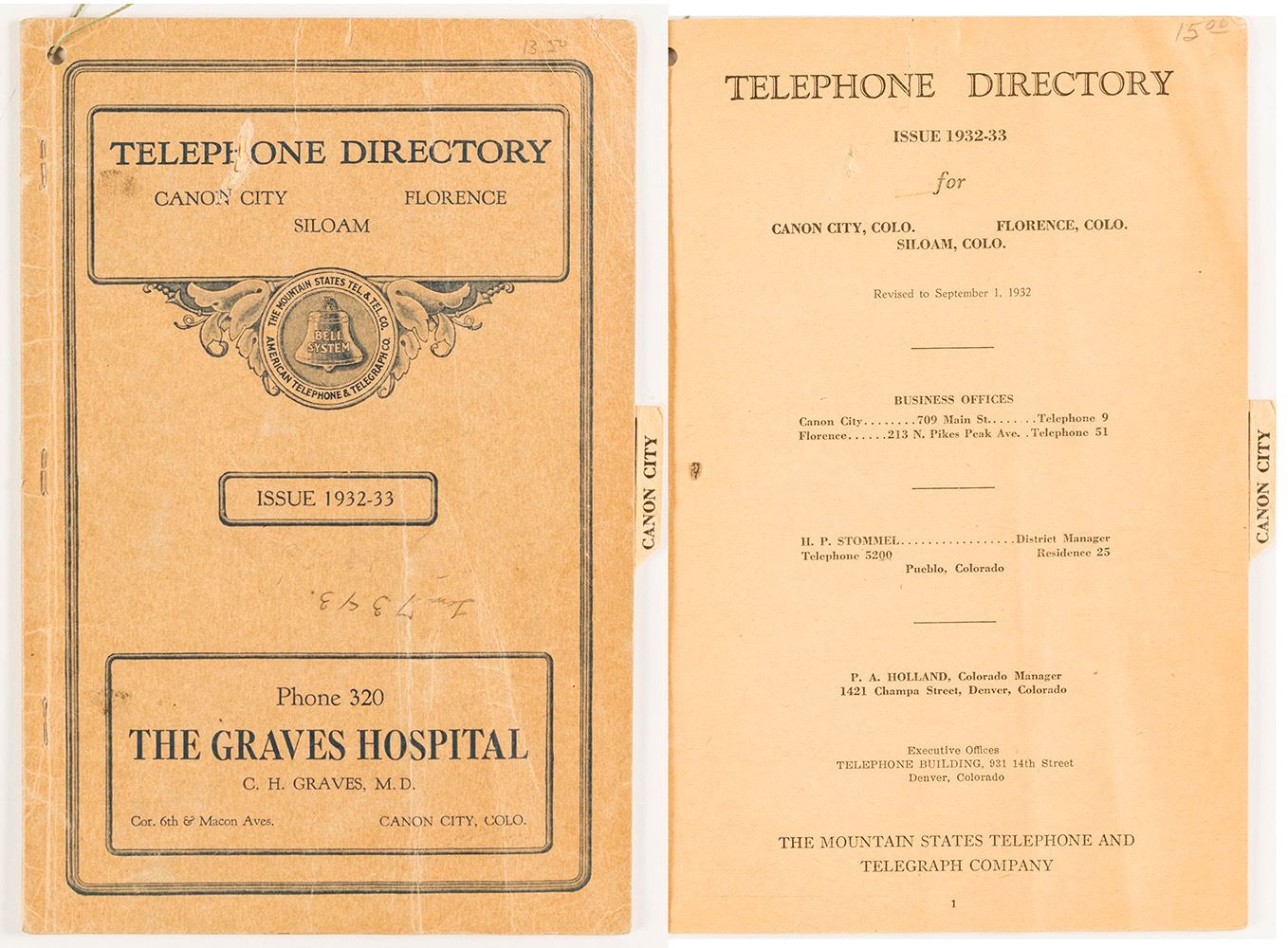 Old telephone directory for Canon City, Florence and Siloam Colorado. Paper bound 26pp 1" top tear thru all pages. 9.25" x 6.25". Date: Location: Colorado HWAC # 54335