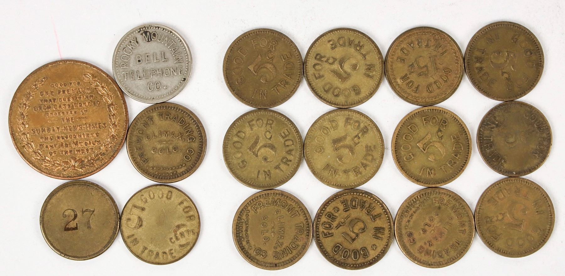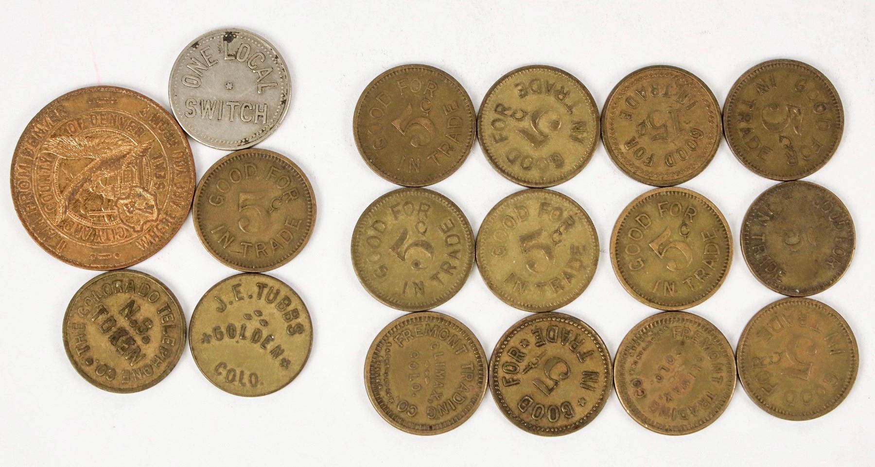 Seventeen Colorado tokens: Fremont Trading, Climax (several); Chas. Sitterle, Golden; Colorado Telephone Co.; Opera House Cigar Store, Golden; J. E. Tubbs, Golden; Dattlebaum, Cripple Creek.