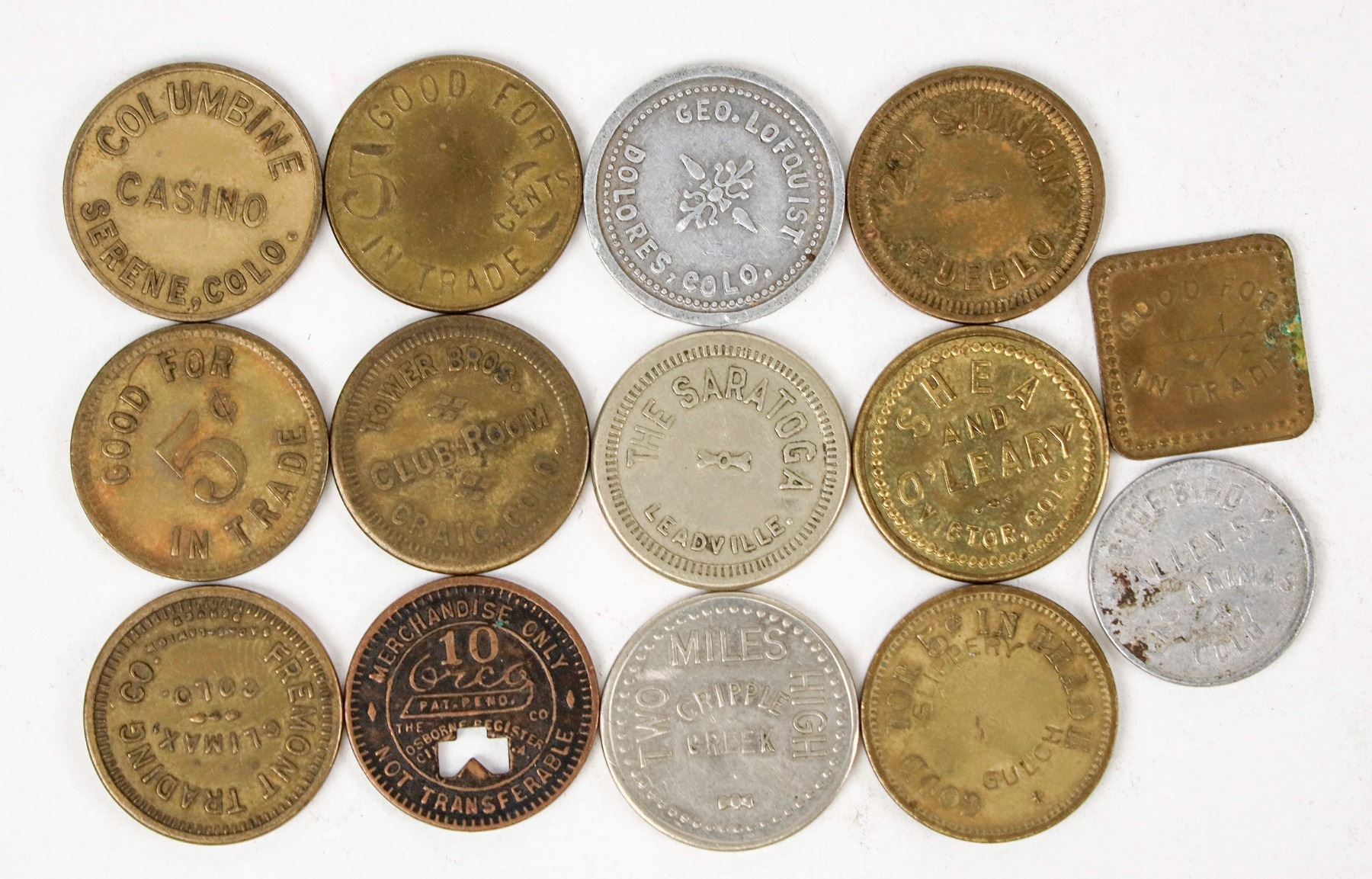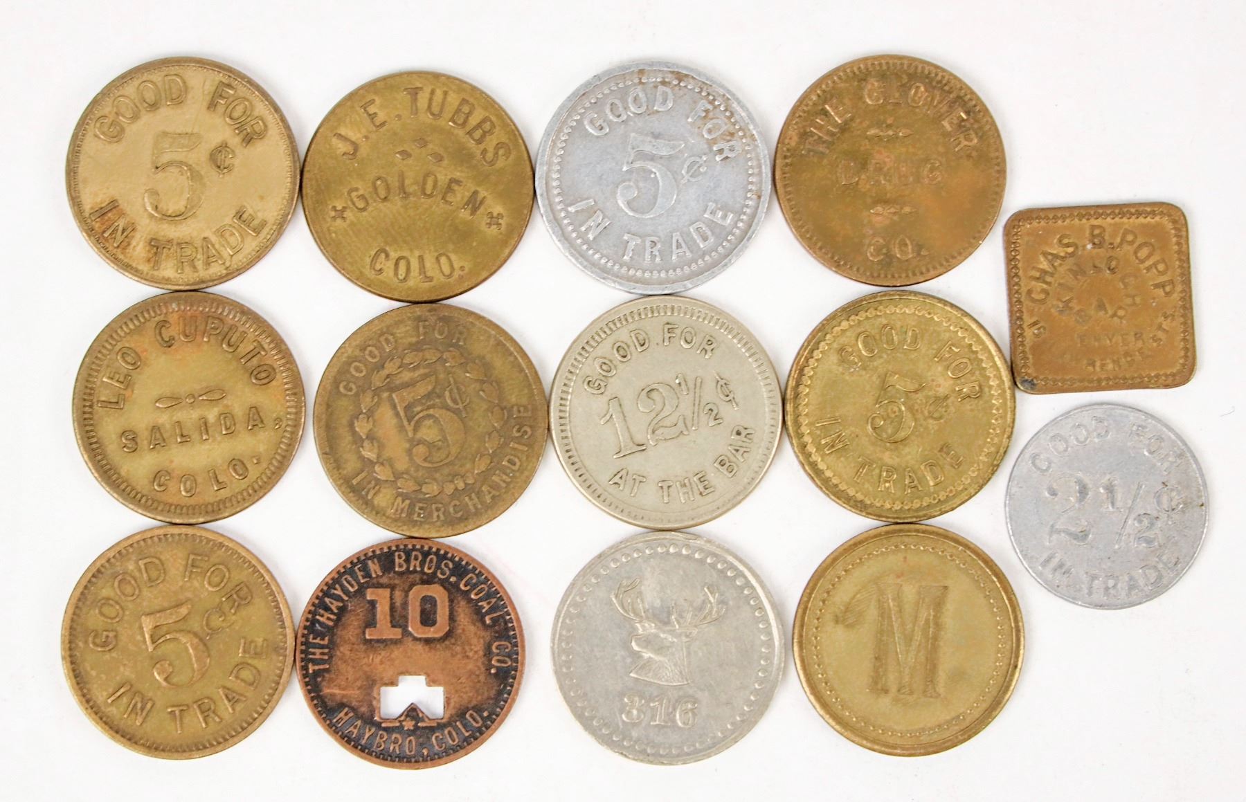 Fourteen different Colorado town tokens: Las Animas; Leadville; Dolores; Serena; Haybro; Salida; Pueblo; Craig; Golden; Cripple Creek; Victor; Climax, Denver, Slippery Gulch.