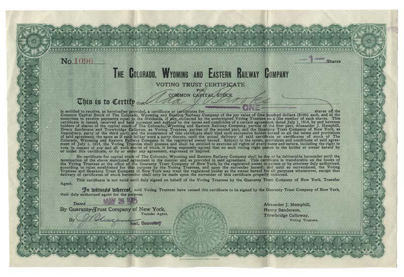 1915, Colorado. Stock certificate for 1 share. Green\Black. A very scarce Colorado railroad. Uncancelled and Extremely Fine.