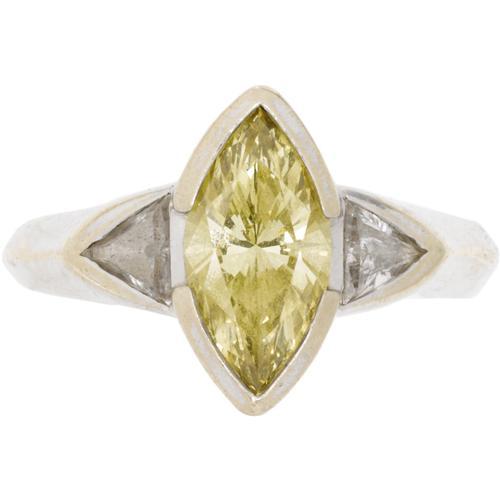 <B>Colored Diamond, Diamond, Gold Ring</B></I><BR><BR>The ring centers a marquise-cut brownish-yellow diamond measuring 12.00 x 6.00 x 3.75 mm and weighing approximately 1.39 carats, enhanced by triangle-cut diamonds weighing a total of approximately 0.33 carats, set in 18k white gold. Gross weight 5.10 grams.<BR>*Note: Size 7 (sizeable) <B>Condition Report:</B> Ring<BR><BR>Diamonds<BR><BR>Average Color: JKL<BR><BR>Colored Diamond Color: Brownish-Yellow<BR><BR>Average Clarity: SI<BR><BR>Shapes: Marquise, Triangle-Cut<BR><BR>Diamond Count: 1-25<BR><BR>Overall Condition: Very Good<BR><BR>Notes: Diamond weights are stamped into shank of ring.<BR><BR><BR><b>Shipping:</b> Miscellaneous Collectibles, Smal (<a target="_blank" href="http://www.heritageauctions.com/common/shipping.php">view shipping information</a>)