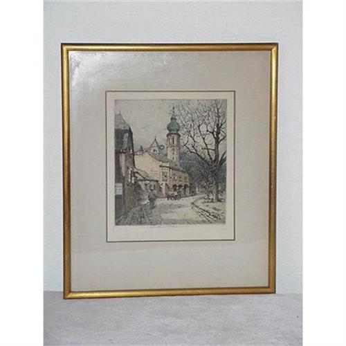 A framed engraving of a village scene, 16 3/4" X 14" framed size, A church tower in the background overlooks a cobblestone street lined with shops and a lone figure looks to be sweeping the street while a horse drawn carriage is further down the road. Pencil signed, label on back reads: M/E Framing guild 1063 Madison Ave. Bet. 80th & 81st streets NYC Butterfield 8-8337, Formerly with Braus Galleries. Simple gold frame, condition is very good, image free of foxing. (3)