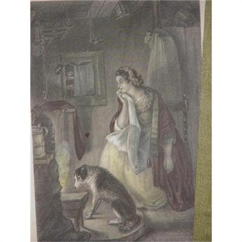 Framed 11'' x 13'' colored engraving; the image is 6 1/2'' x 4 3/4'' with a green colored fabric covered mat. Engraving loose in frame.