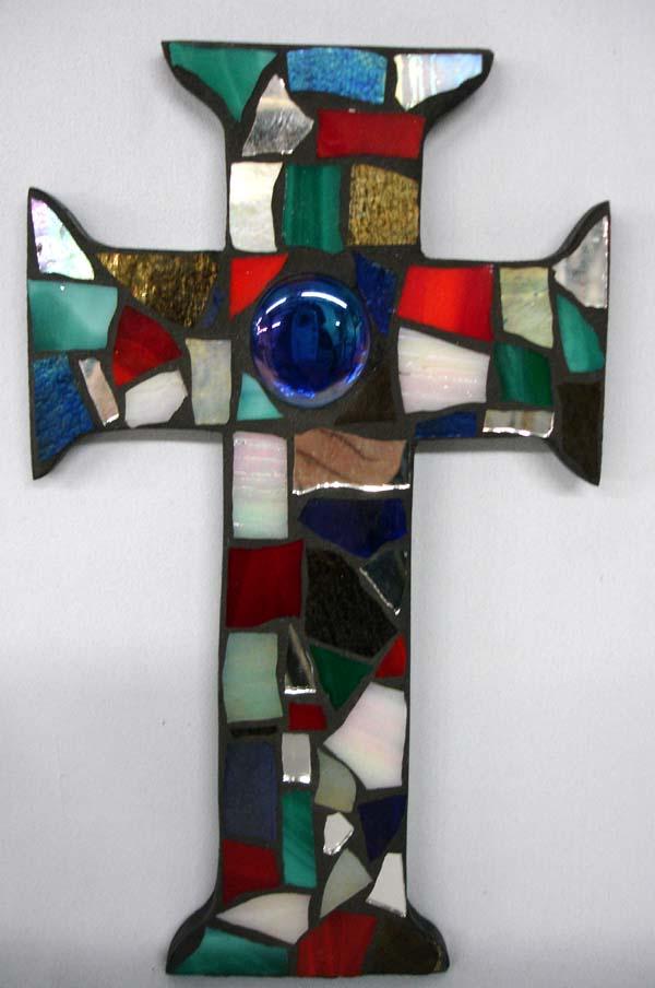 Colored Glass Mosaic on Wood Cross Wall Hanging. Signed on the back, ''Gayle 2007''. Measures 10.75''x6.25''.Buyers Pay Actual Shipping and Handling Charges(see terms and conditions for more information).