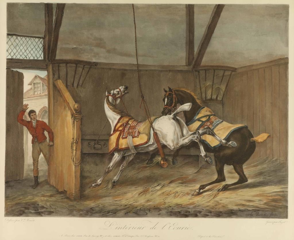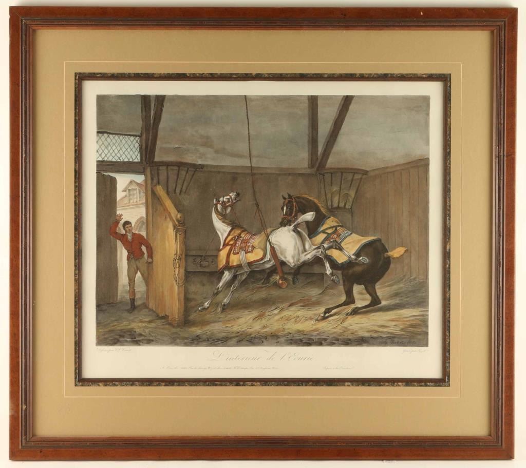"L'interieur de l'Ecurie" signature lower right. Image measures 17 1/2" x 21 1/2" in mat with V-groove, fillet and wood frame. (1758 - 1836) Carle Vernet was active/lived in France. Carle Vernet is known for paintings of horses,