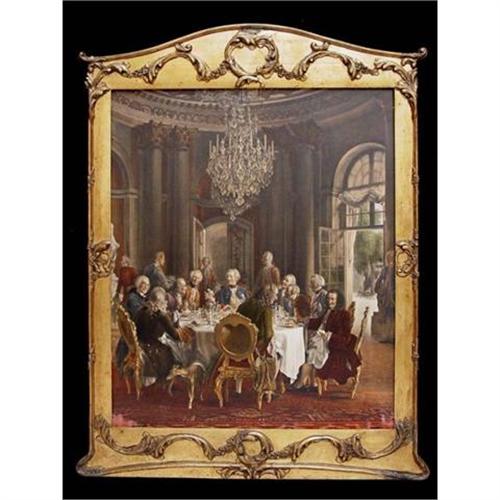 Rare colored framed print / oilgraph made in Holland of the famous von Menzel painting "Die Tafelrunde" (The round table) in an elegant gold frame. It is marked on the back: Made in Holland Framed Picture Serie No. 324 Titel: Die Tafelrunde Kunstler: A. v. Menzel. Adolf von Menzel (b. 1815 Breslau (Wroclaw), Poland, d. 1905 Berlin) was a distinguished German Realist painter best known for historic paintings illustrating the life of Frederick the Great. Die Tafelrunde illustrates a dinner party at Château Sanssouci near Berlin, hosted by Frédéric II (the Great). Among the guests are Voltaire and other personalities of the time. In good used condition with signs of wear as shown. Please ask questions, request additional photos and shipping costs before buying.