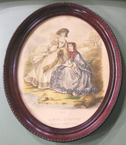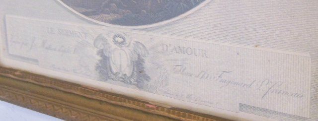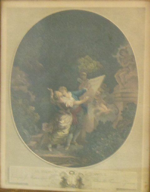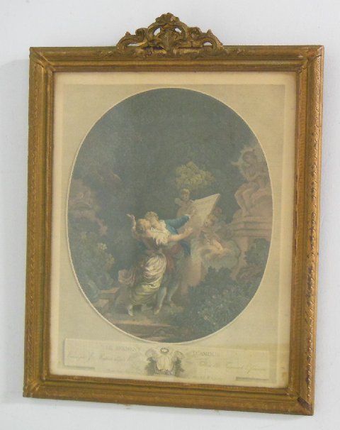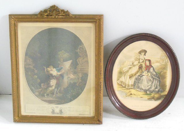 1- Fragonard colored engraving ca. 19th c., framed approx. 23" x 18". 1- "La Mode" illustre print, approx. 18" x 15".