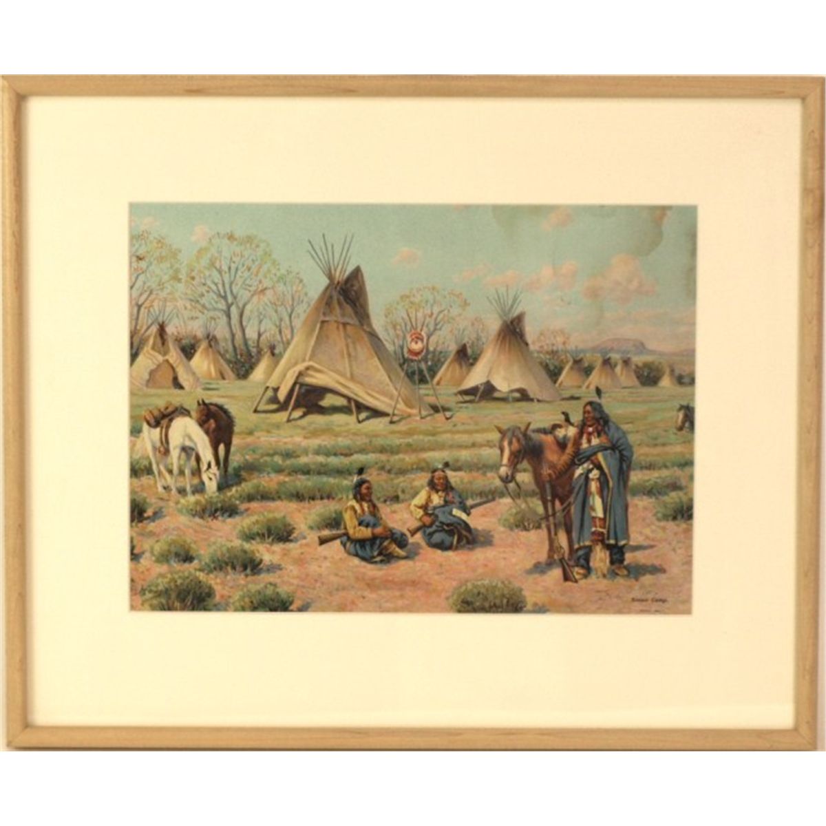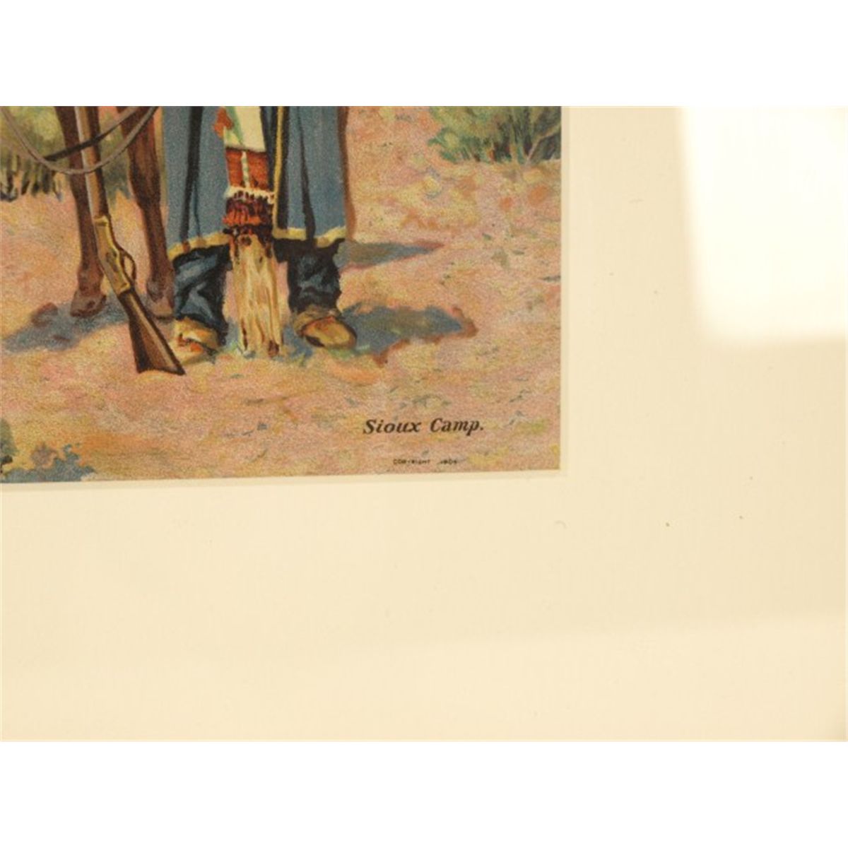Colored lithograph "Sioux Camp" 1906 by John Hause with Native Americans holding lever action rifles including a Winchester 1866.