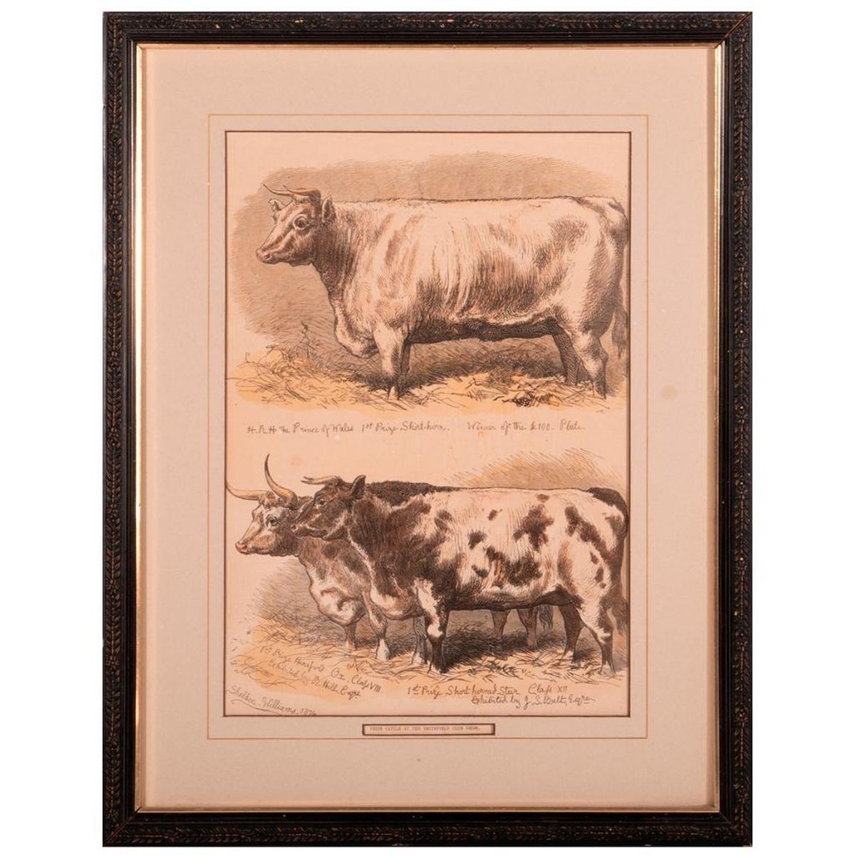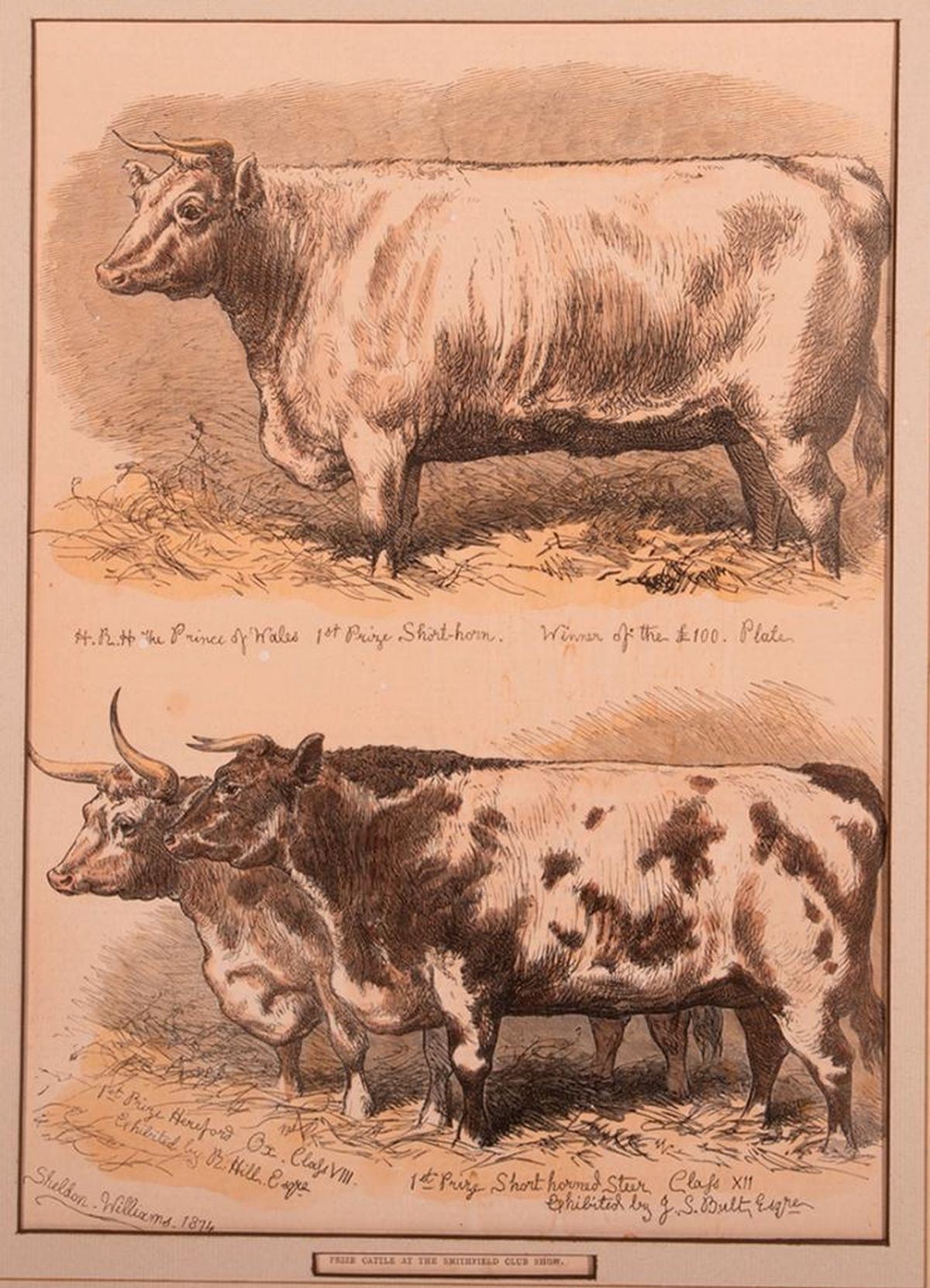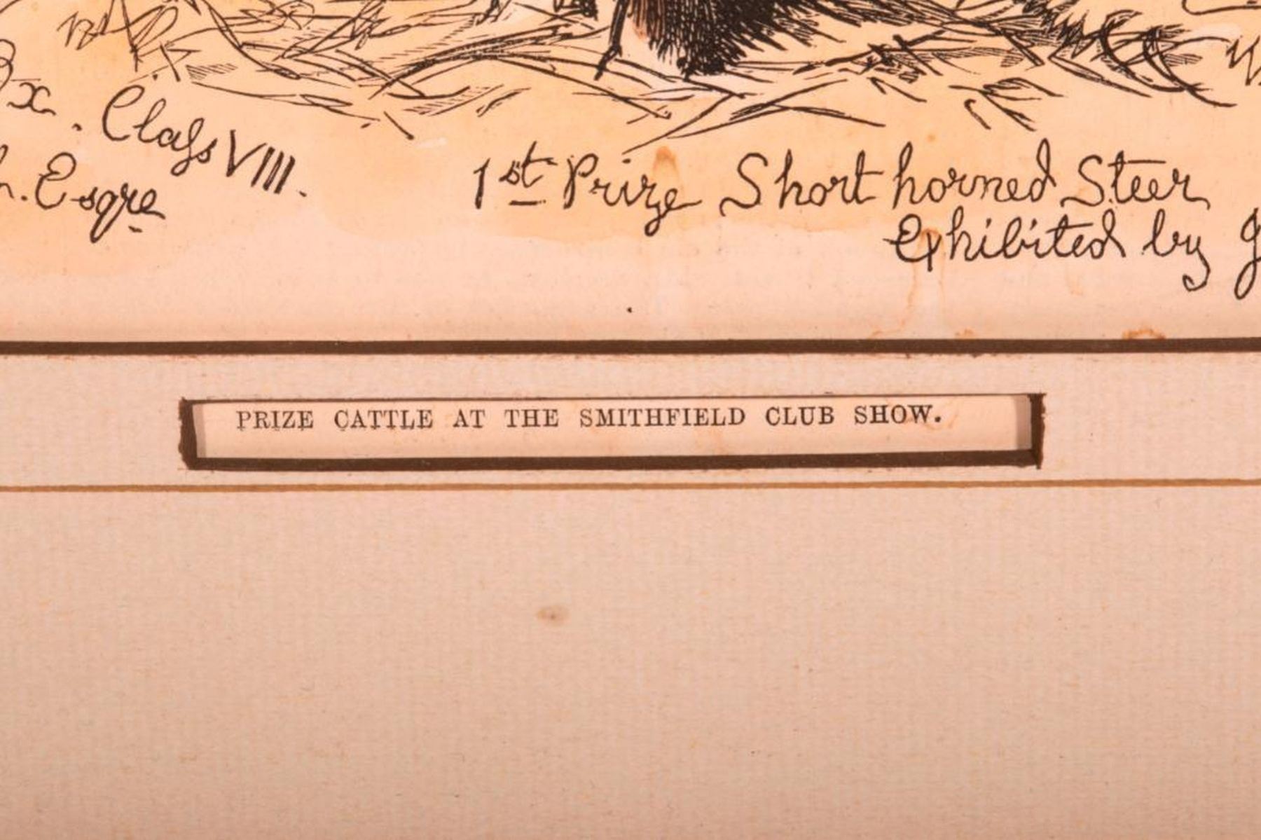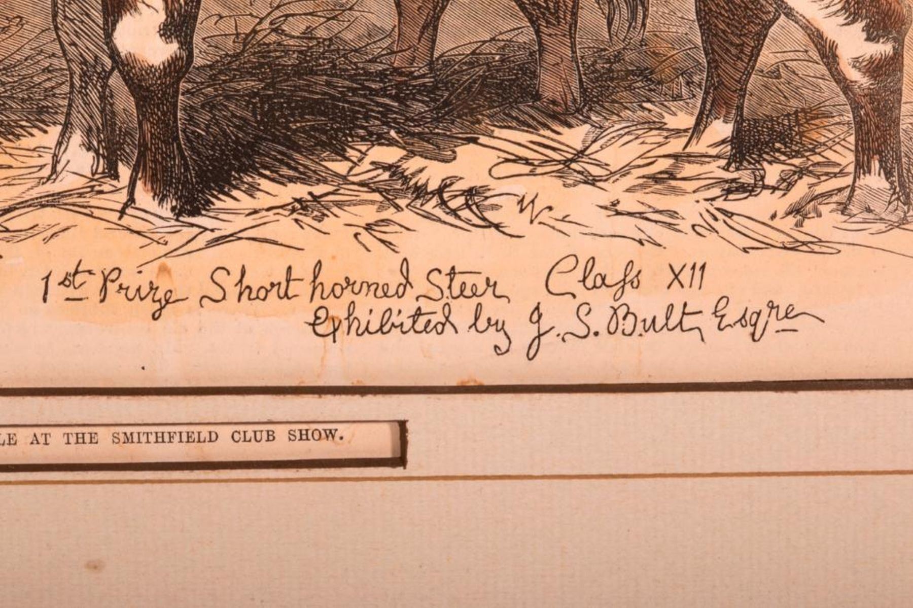 Frame: 19 ¼ inches high x 15. Image: 13 ½ inches high x 9. Condition good, "The Cattle at the Smithfield Club Show". Missing glass.