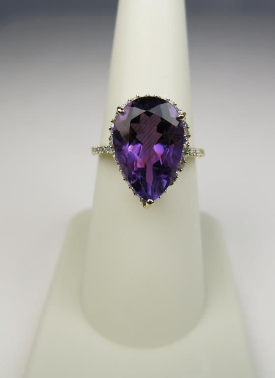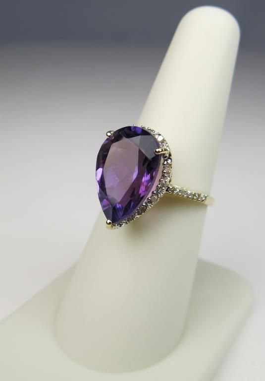 Colorful 10 karat yellow gold ladies ring set with a large pear shape Amethyst weighing approx. 7.00 carats and side diamonds. Retail $1,200.00 Estimate $500-$800