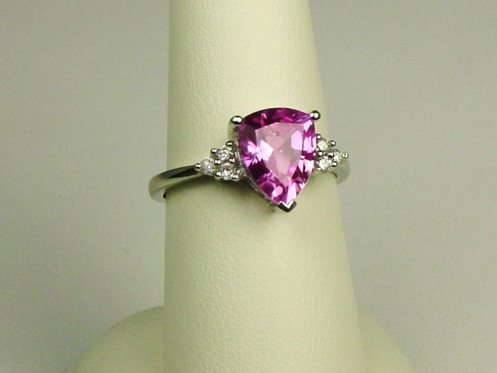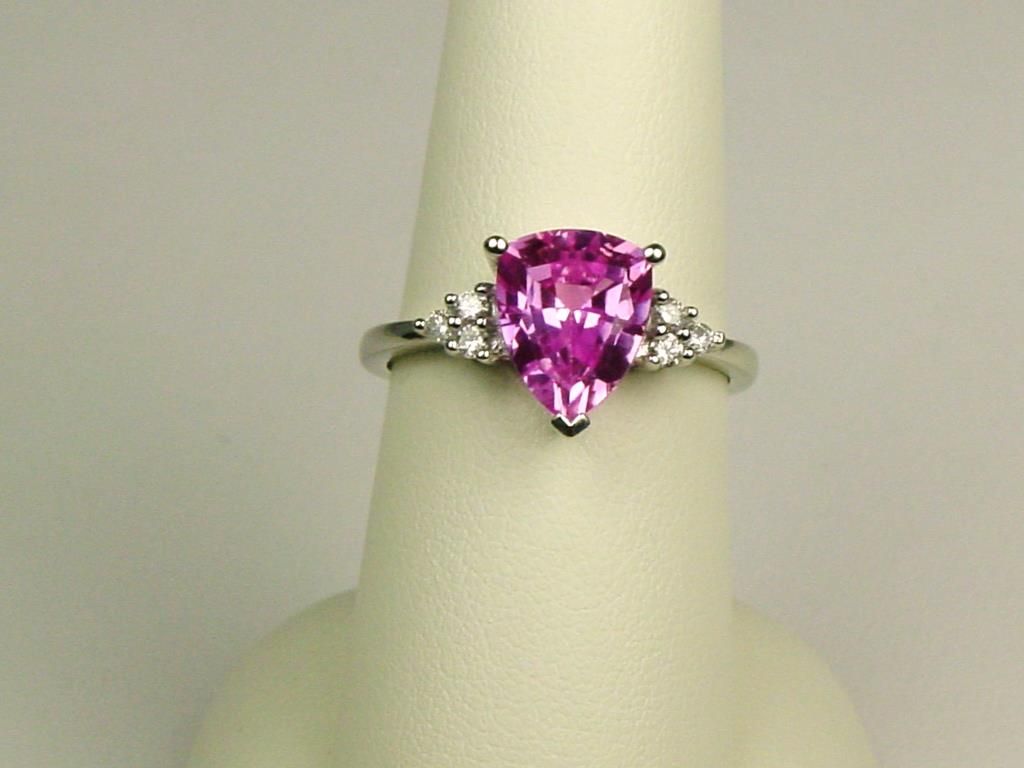 Set with a pear shape pink Topaz weighing approx 4.00 carats and 6 side diamonds weighing approx 0.15 carats of G-H colors and SI clarity.