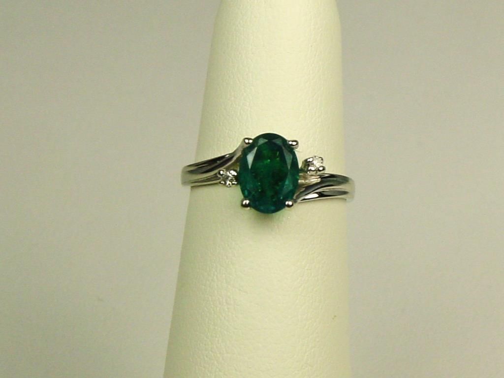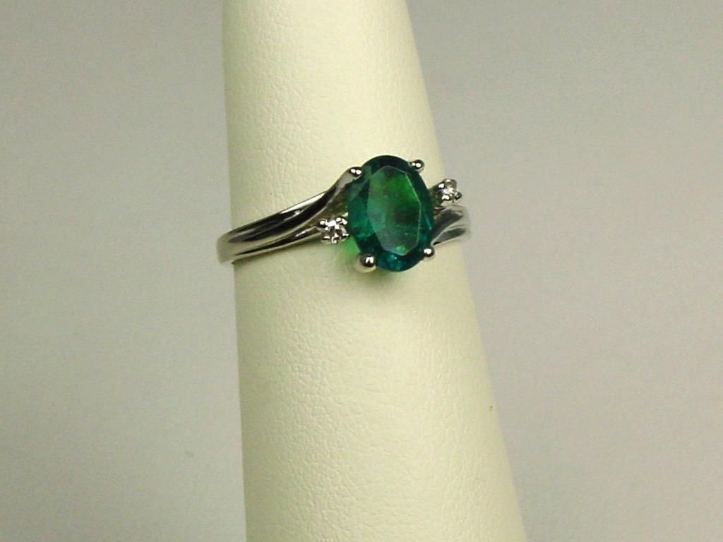 Set with a created Emerald weighing approx 1.50 carats and side diamonds.