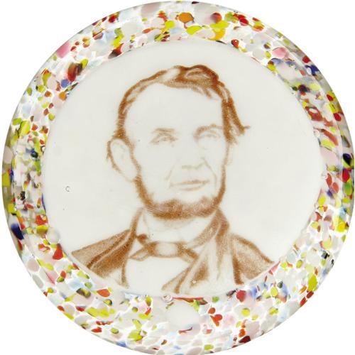 <B>Colorful Abraham Lincoln Globe Paperweight</B></I> with an encased sepia-colored portrait. This heavy (nearly two pounds) blown glass item is 3.25" in diameter and 2.5" tall. Nearly flawless.<BR><BR><b>Shipping:</b> Miscellaneous Collectibles, Smal (<a target="_blank" href="http://www.heritageauctions.com/common/shipping.php">view shipping information</a>)