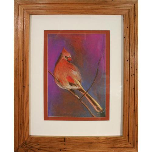 Marvelously colored, ?Colorful Bird? is a wonderfully vibrant pastel drawing by talented artist, R. Brown. A beautiful female cardinal is depicted perched on a thin branch. While the females of the species are usually less colorful than their red counterparts, Brown infused the composition with bold colors to enhance the otherwise neutral tones. Vivid violet shifting to blue-violet electrifies the background and compliments the softer red-orange tones of the bird?s plumage. The drawing has been double matted with a bottom mat of deep rust, which echoes the areas within the composition where the blue and violet give way to brown, and a winter white top mat which draws out the highlights of the birds feathers. The piece is mounted in a medium oak wood frame which reinforces Brown?s naturalistic theme and brings the total measurements of the piece to 18 ¼? x 22 ¼? The unique matting and framing presentation of this piece was individually selected and created by Le Chateau?s renowned master framer, Jeanette Shoenrock, and bears her signature on the back. This is truly a striking piece that would be perfect for those who do not shy away from brilliant colors, and priced at such a bargain it is really too great a deal to pass up.