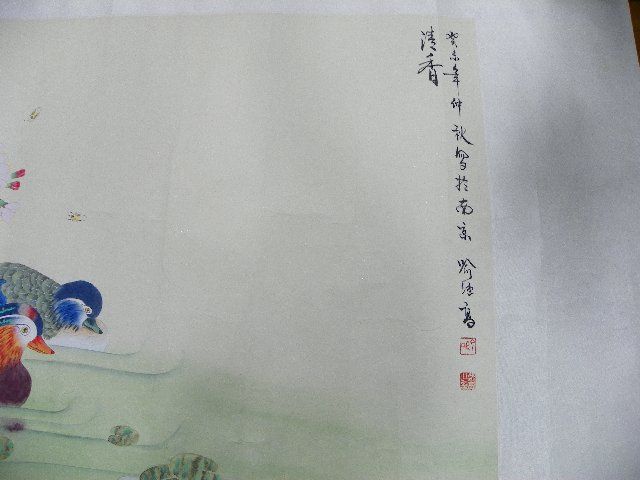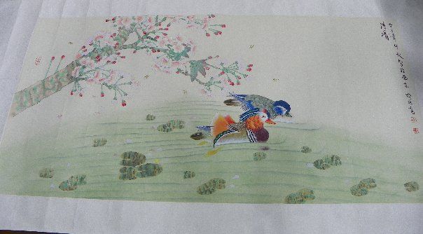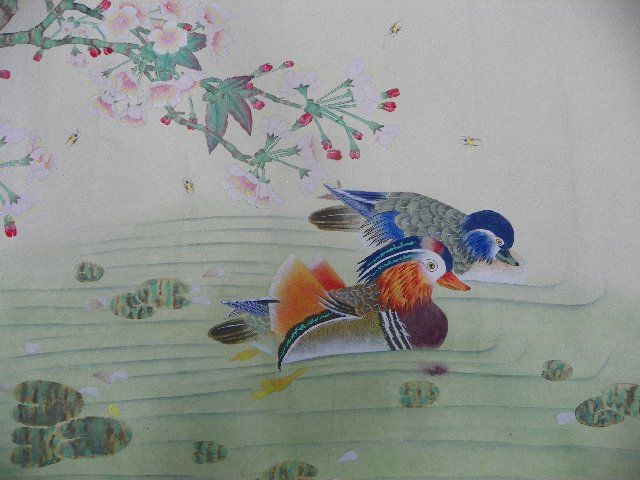 "Two Birds in the Water Under a Tree Branch". Approx. 52" x 25.25". Please read our terms of sale.