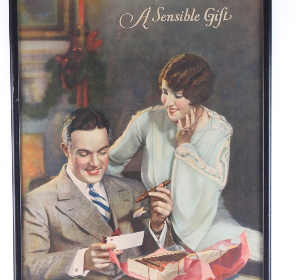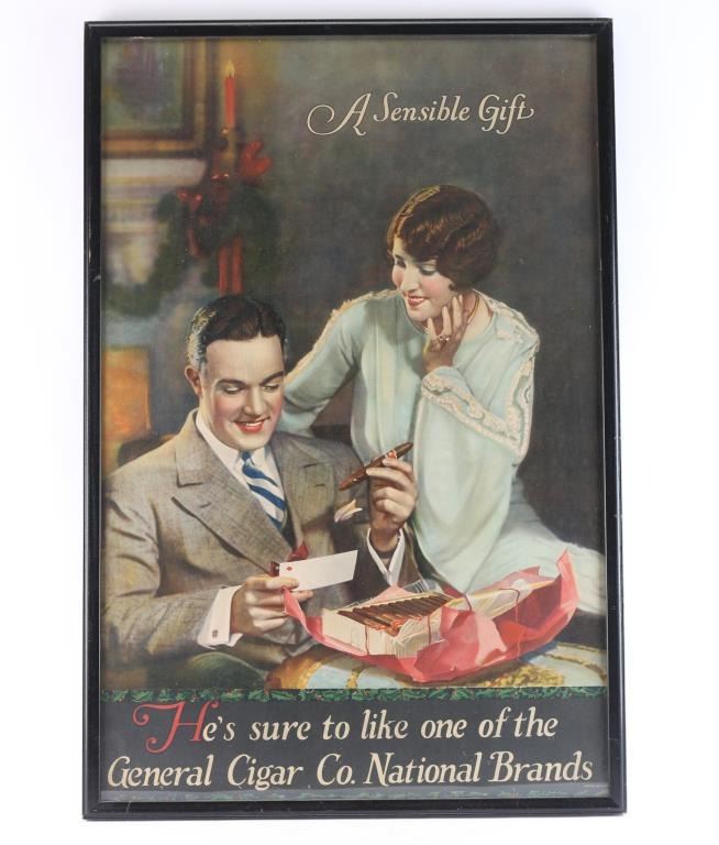 With expression top right "A Sensible Gift" and "He's Sure to Like One of the General Cigar Co. National Brands". Showing prewar scene of man and woman with man opening box of cigars. Approximately 34" x 23". Very good condition, minor natural aging.