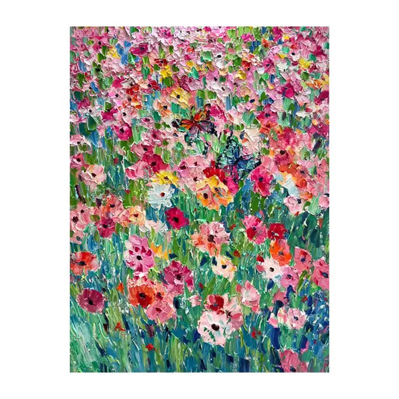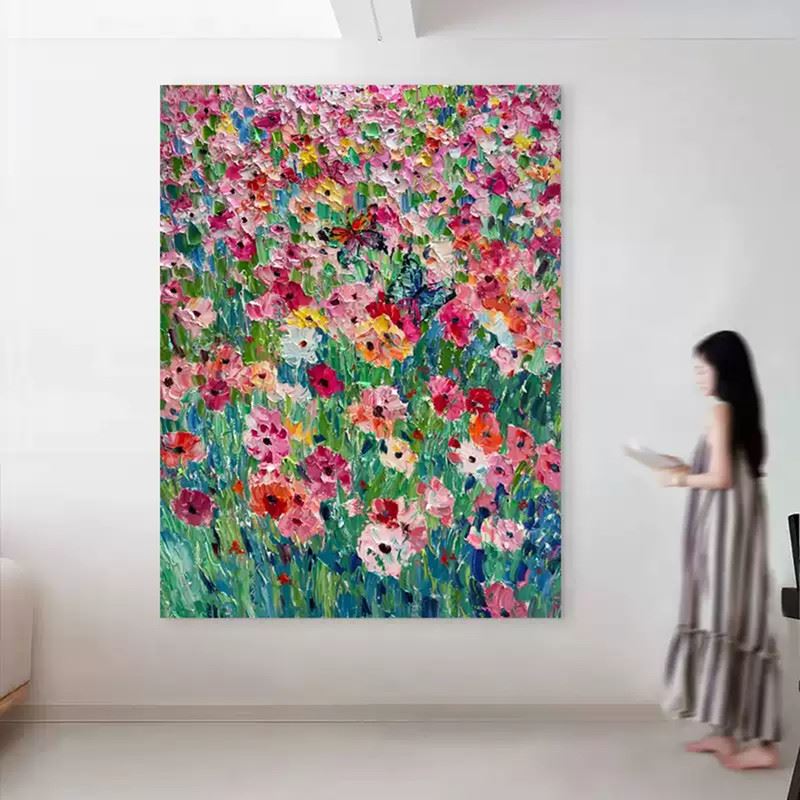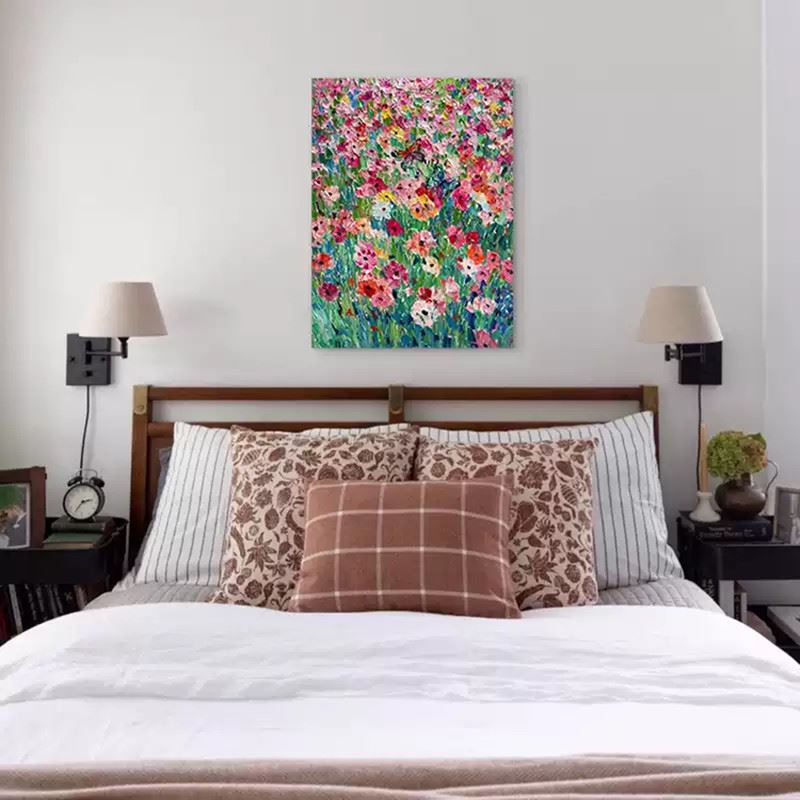 A sea of blossoms spreads across the canvas, where pinks, oranges, and fresh greens merge into rolling waves of color. The rich palette-knife strokes make each flower feel alive, softly whispering its own springtime secrets and joy. Dimensions: 24 x 31 inches.