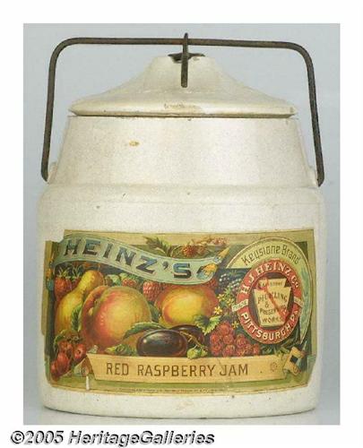 <B>Colorful "Heinz's Red Raspberry Jam" Label on a Weir Pottery Crock</B></I> A wonderful color Heinz label in a hard to find size. This Weir pottery crock with snap lid has an original large size Heinz label. The crock is nearly 9 1/2" tall, with the label measuring 9" x 4". The Weir containers were made to be used over and over again, so it is indeed unusual to find one with a label so large. A small corner is missing at the top of the label and a larger section on the bottom left. Neither missing piece diminishes this label. Normal aging to the paper does not keep this piece from being bright and very near mint. A beautiful label! Lot:252