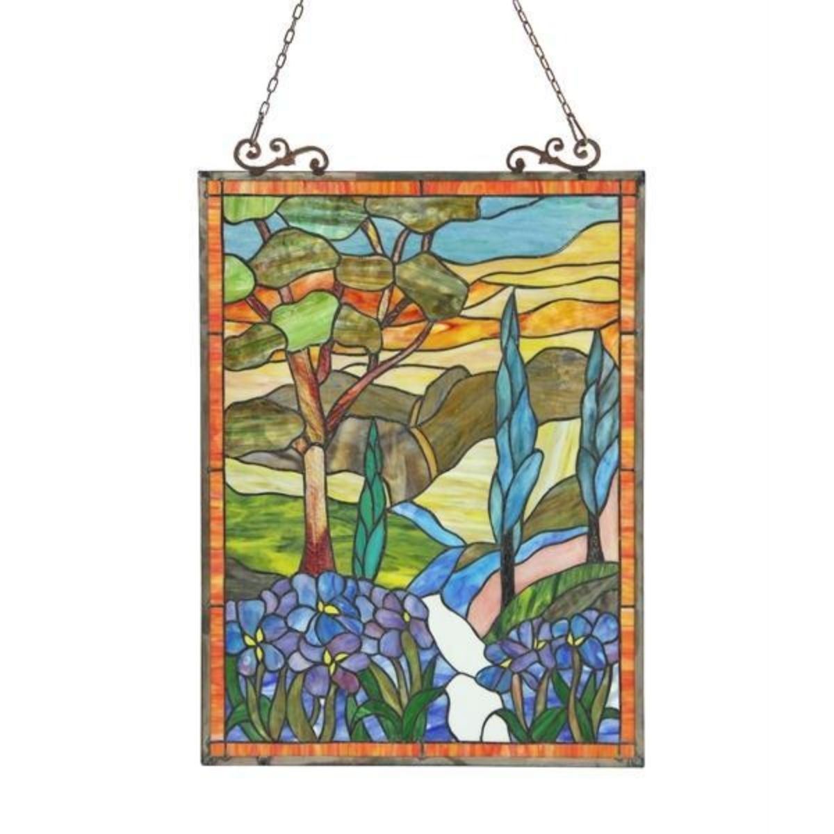 Colorful landscape stained art glass hanging panel, created from 264 pieces of art glass, wrapped with copper foil, with antique bronze finish. 24" H X 18" W. Comes with hanging chain.Â