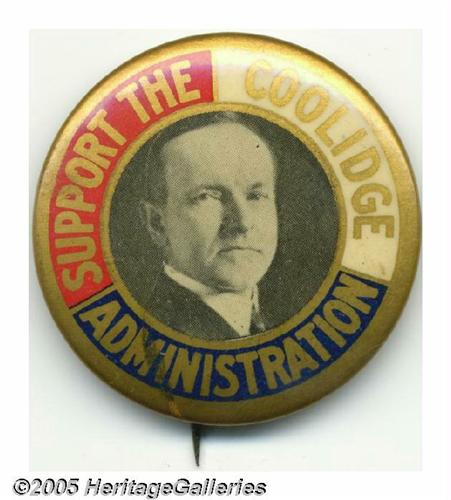 <B>Colorful Large 1 3/4" Calvin Coolidge Pin</B></I> This bold design is a real standout among the generally drab style of 1920s political buttons. A choice and "minty" example, free of the surface bumps which afflict a high percentage of this variety. Also beautifully centered, hard to find on this item. The only negative is a light blue ink smear (under the celluloid, as manufactured) at 7:00. Like most larger Coolidge varieties, it is very scarce. Lot:263