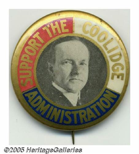 <B>Colorful Large 1 3/4" Coolidge Pin</B></I> This scarce beauty is one of the most striking and attractive Coolidge designs, a perfect centerpiece among the generally drab button designs for this candidate. Nicely centered (not always the case with this variety). Completely free of the surface bumps which afflict many examples of this button. A few very minor tiny flecks on the gold border are noted for accuracy, but overall a distinctly above-average copy. Lot:262