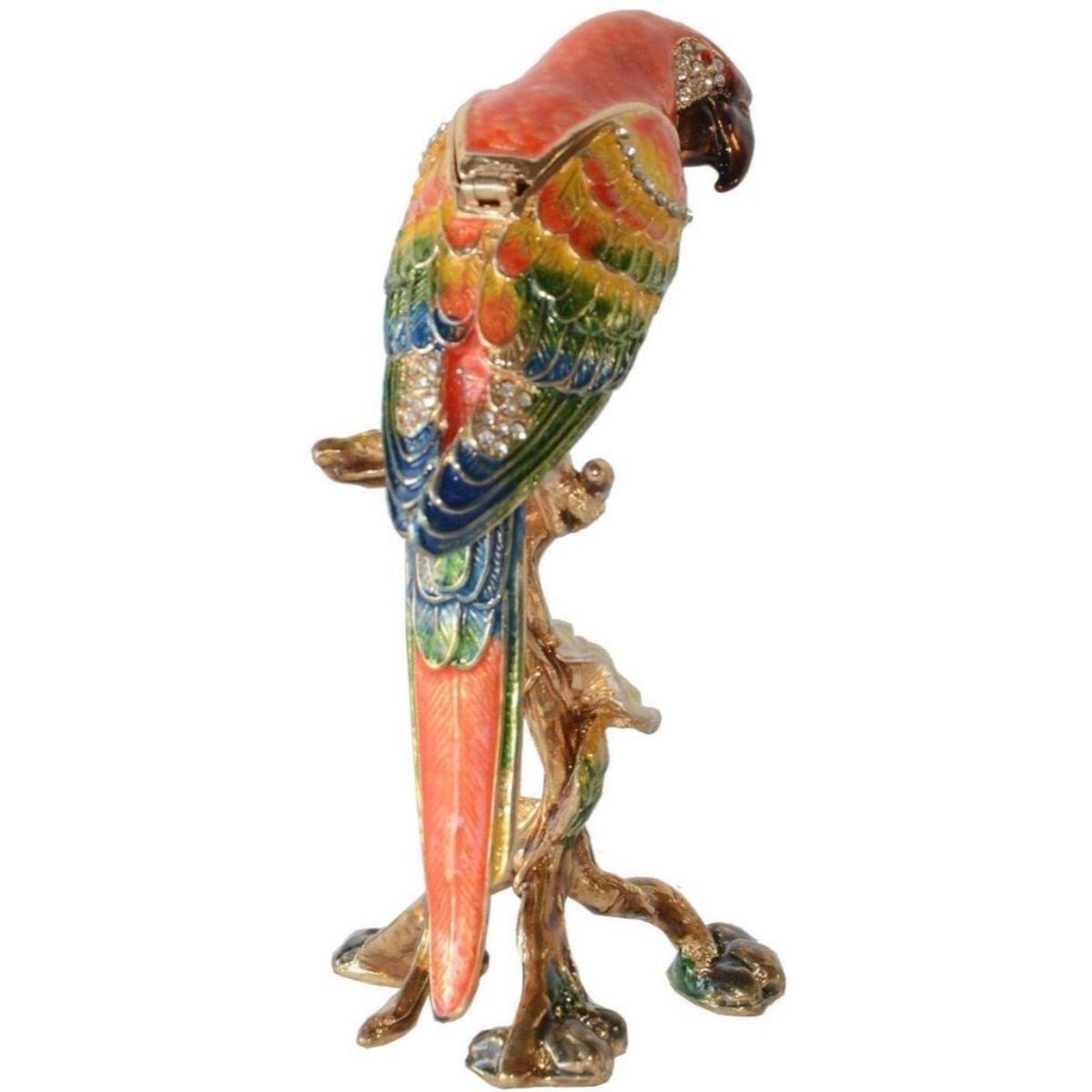 Colorful macaw parrot bird trinket jewel box. Enamel & gilt over pewter, with embedded Austrian crystals. The head of the bird lifts up on a hinge ( with magnetic closure ) to reveal an enameled interior for trinkets or jewels.Â