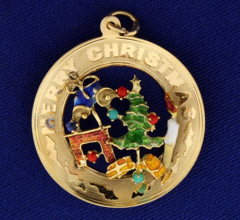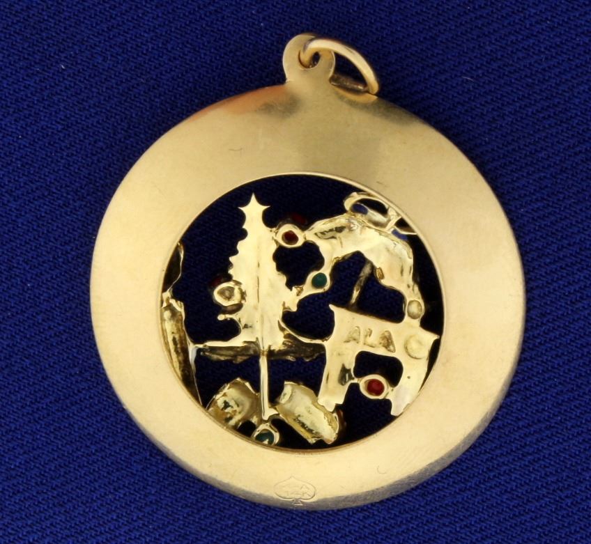 In 14k yellow gold. Contains six high quality 1.5mm cabochon natural gemstones - three rubies, two turquoise gemstones, and one sapphire. 1 1/2" long with bale. 5.0g.