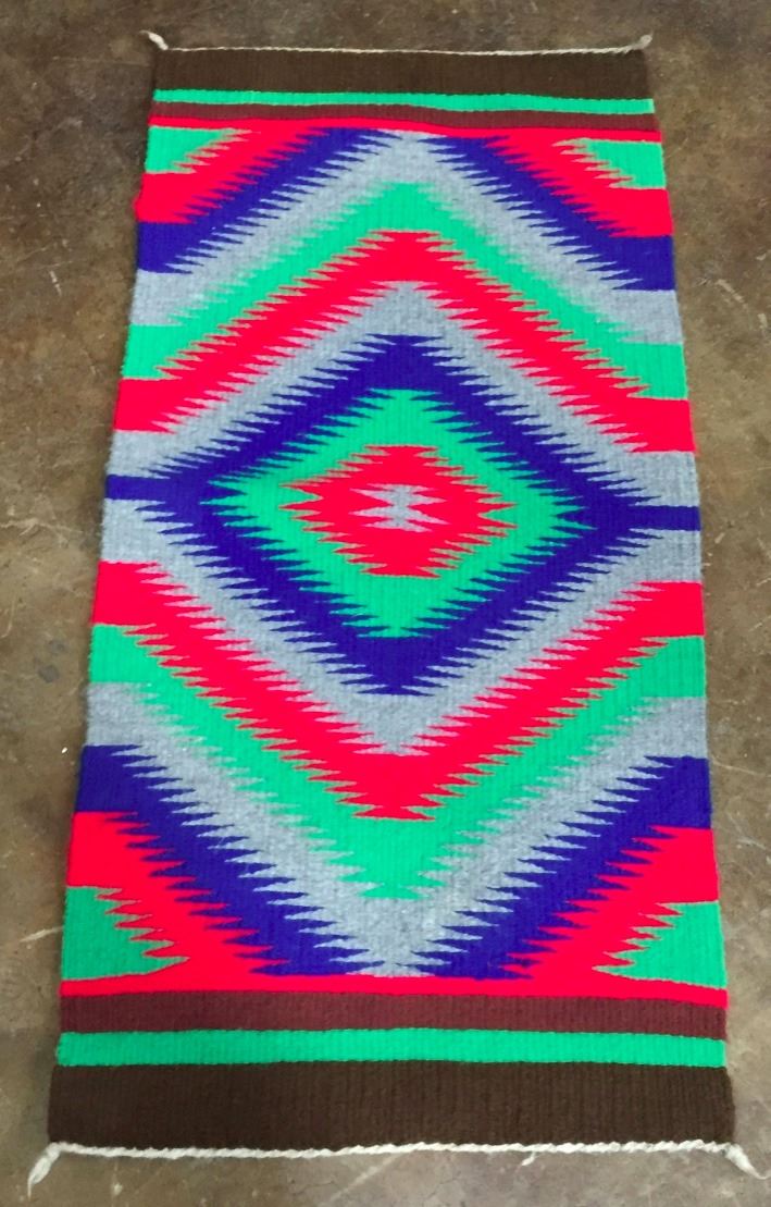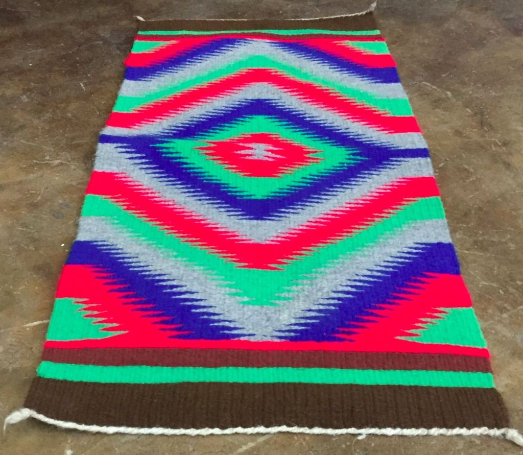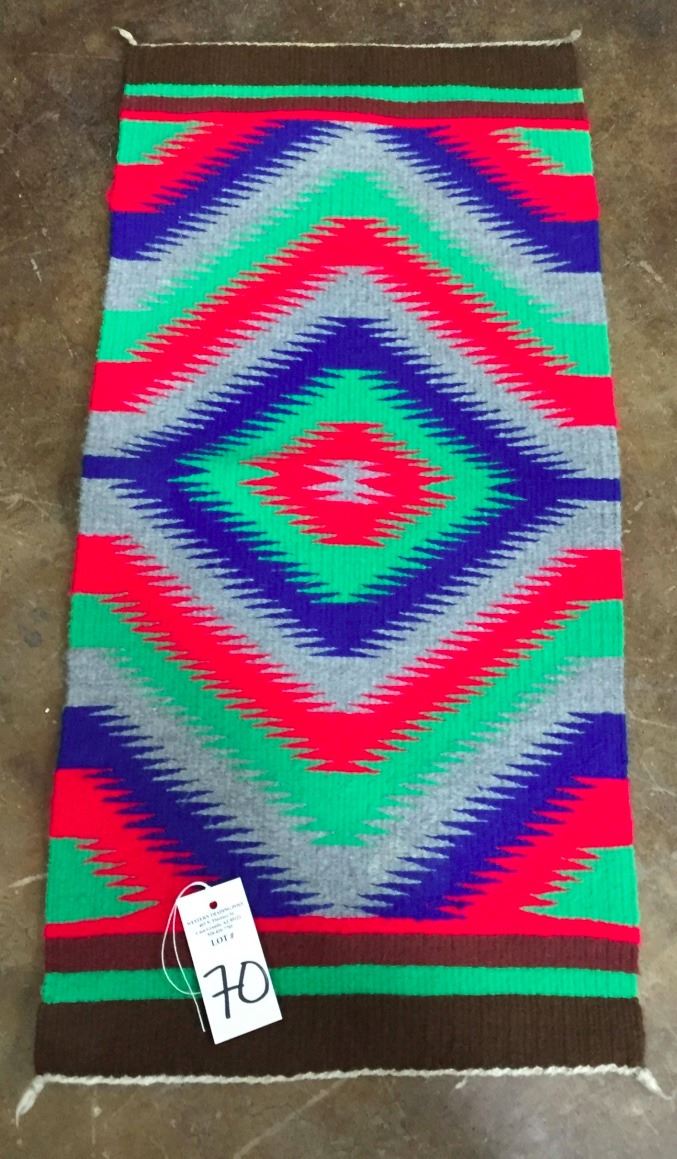This colorful Navajo textile with eye-dazzler pattern measures 18" x 37". Good condition. Please look closely at the pics as they are an important part of our description. Shipping: There will be a $5 handling / packaging fee for shipping this lot. The actual cost of postage will be added on top of that.