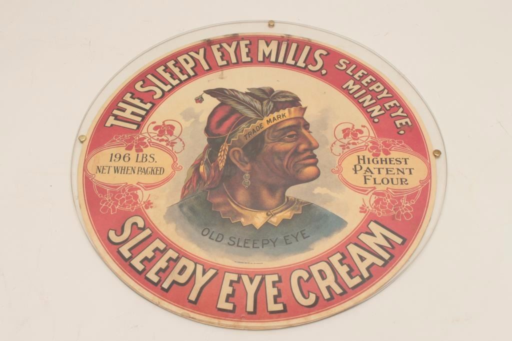 Colorful “Old Sleepy Eye” two-sided color advertiser, with protective frame showing an Indian trade mark, approximately 16” in diameter with bright colors, several minor spots of soiling mostly to edges and notaffecting the overall beauty of the piece. Est.: $200-$400.