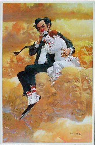 This colorful print is by famous clown artist Robert Owen: * Title: "Friendship" * Off-set printed on glossy stock * Artist's signature appears in the plate LR * Ira Roberts Publishing © 1978 in the LR margin * Sheet size: 18 × 28 * Slight edge creasing all around * Colors are bright and unfaded * * Robert Owen's paintings can be found among many private and corporate collections. A partial list of celebrity collectors include Don Adams, Frankie Avalon, Sid Caesar, Dick Clark, Peter Falk, Jerry Van Dyke, Dionne Warwick and James West. * * An art bargain!