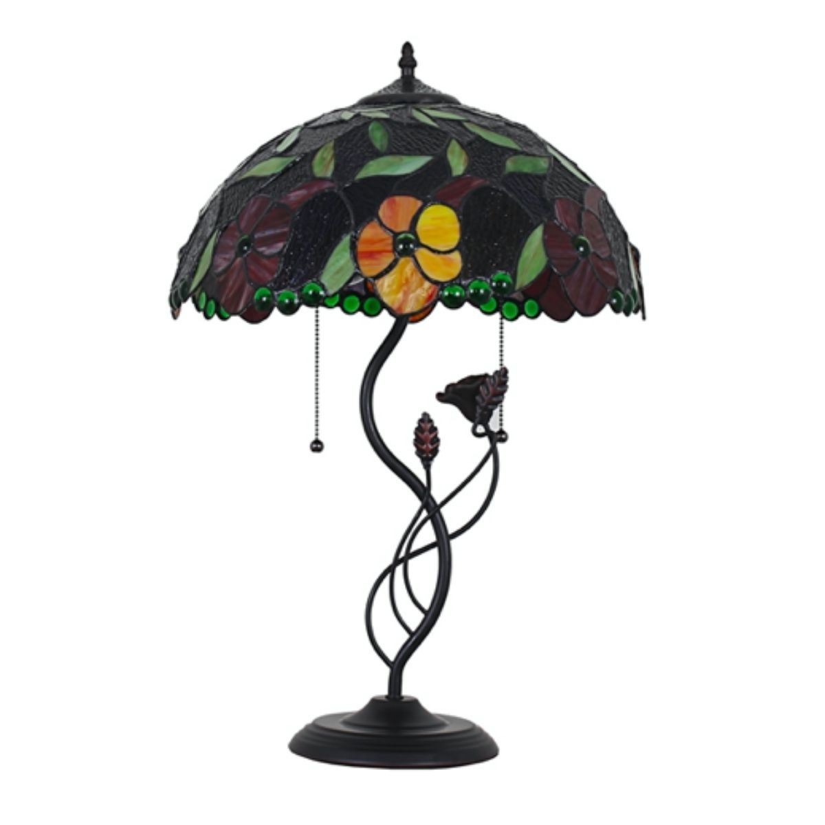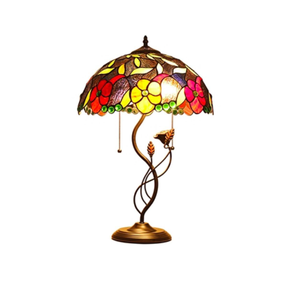 Colorful stained glass 2-light table lamp, with 170 pieces of art glass & 32 glass beads wrapped in copper foil with rubbed bronze finish. Yellow & red floral theme. 24 H X 16" W. Â