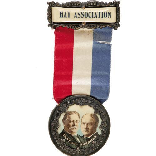 <B>Colorful Taft and Sherman Hat Association Badge</B></I> Most unusual with a 1 3/4" celluloid insert and frame picturing the candidates and hanging from it's red, white and blue ribbon . The celluloid is choice and the badge is excellent save for a minor small edge tear on the ribbon. The badge refers to a trades group at the top.<BR><BR><b>Shipping:</b> Small Collectibles (<a target="_blank" href="http://www.heritageauctions.com/common/shipping.php">view shipping information</a>)