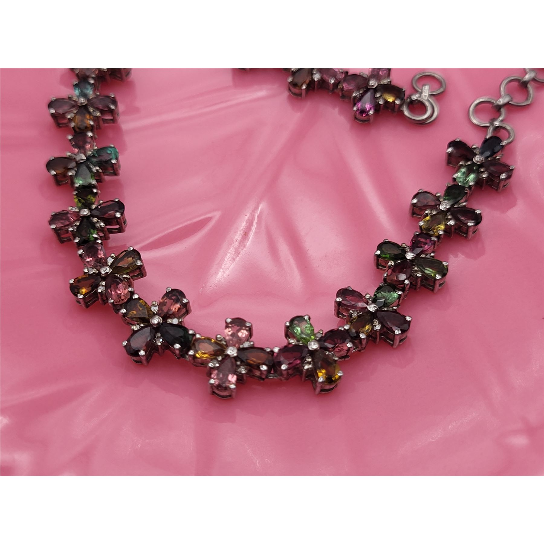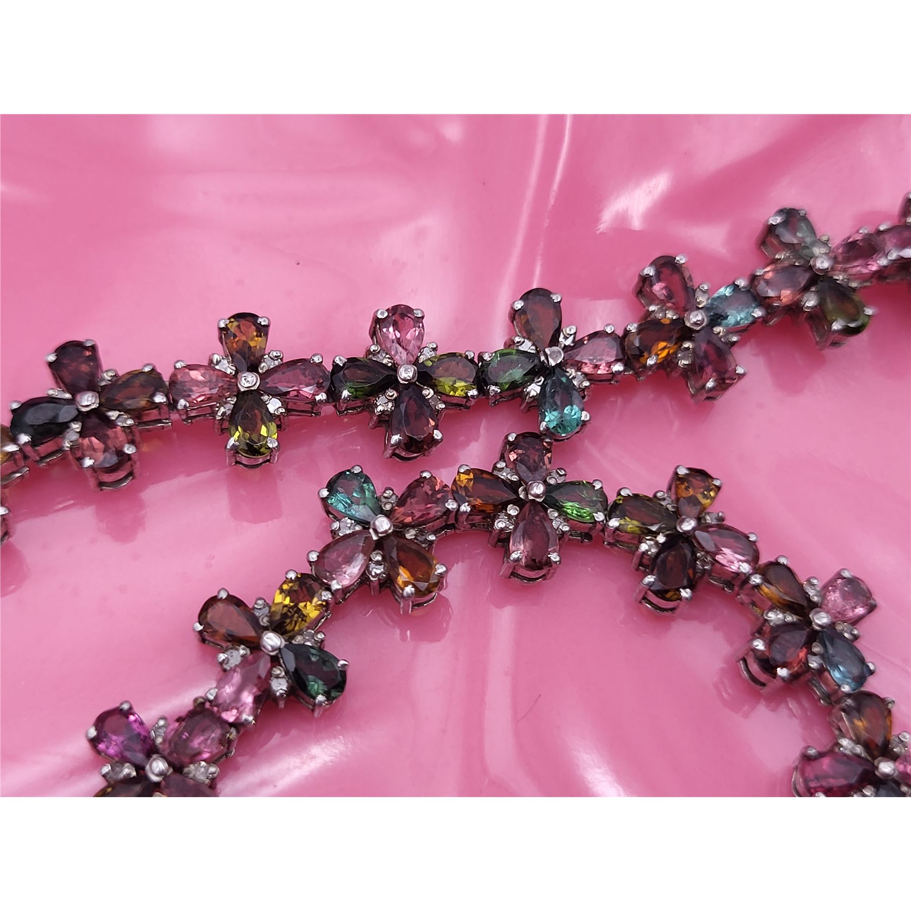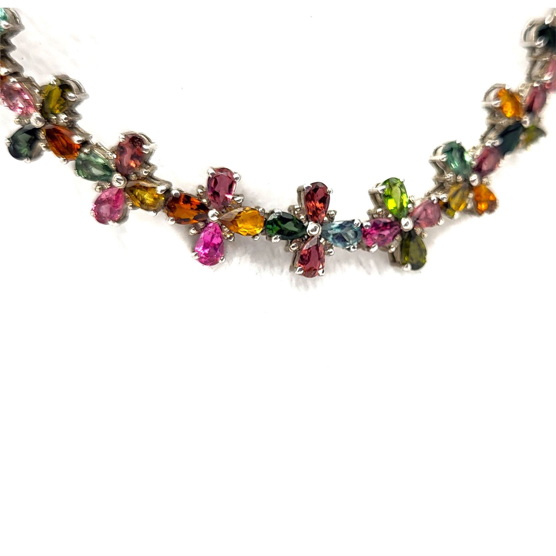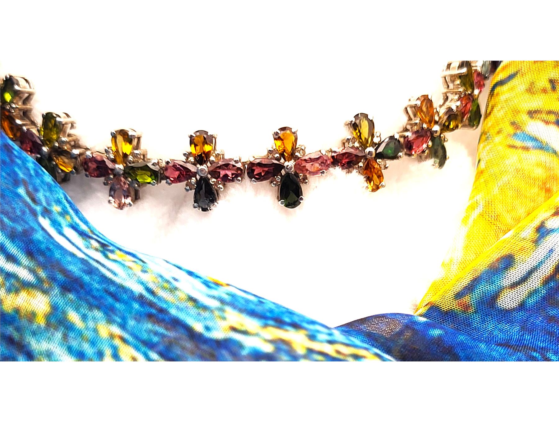 With an incredible range of colors and varieties, it is no wonder that tourmalines are becoming one of the most popular gemstones used by designers today.& nbsp; This incredible necklace is set with over 32.00 carats of pear-cut, prong-set, genuine tourmaline that are arranged in groups of four to resemble colorful flowers 1.92 carats total weight of round, faceted, earth-mined, H-I color, I1-I2 clarity diamonds scattered between the petals, like shiny drops of morning dew.& nbsp; The necklace is 19& quot; to 20& quot; long with the sterling silver extension chain and lobster clasp. Admin: E7159/8-hbh