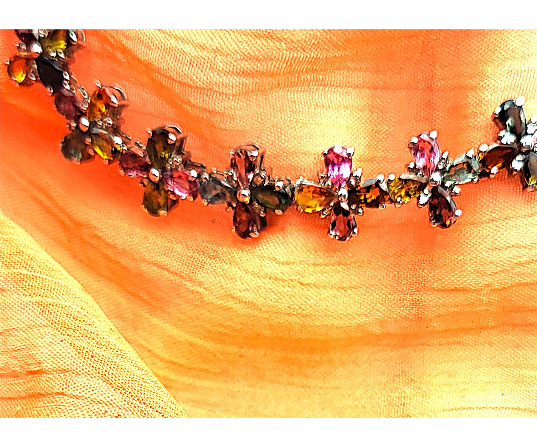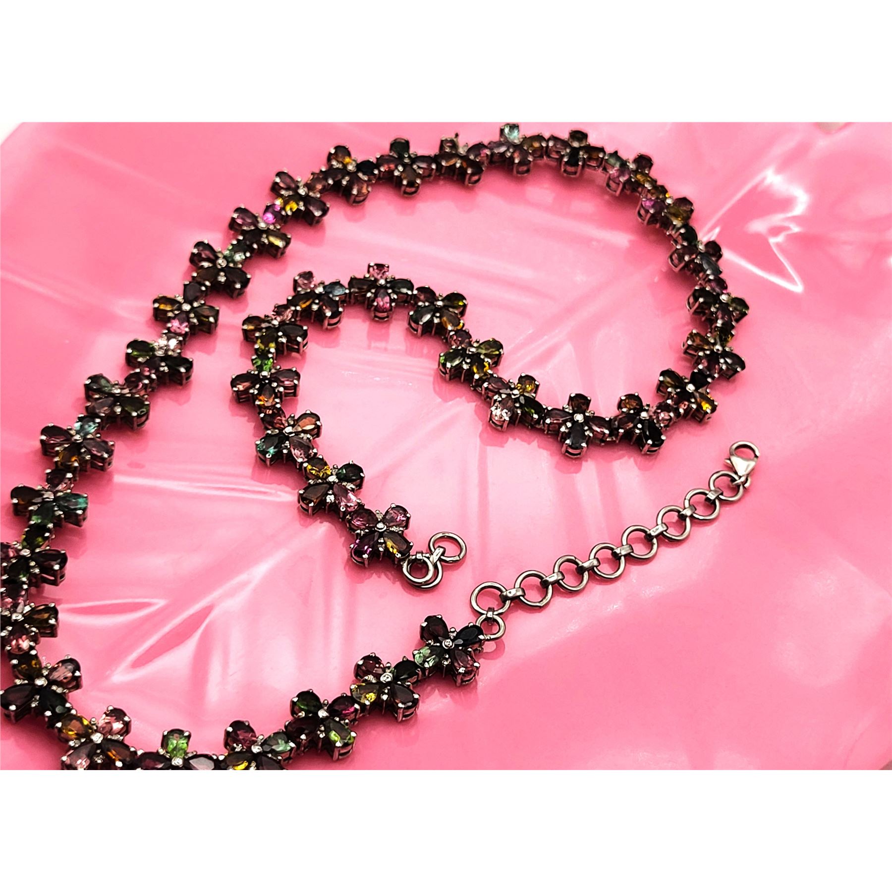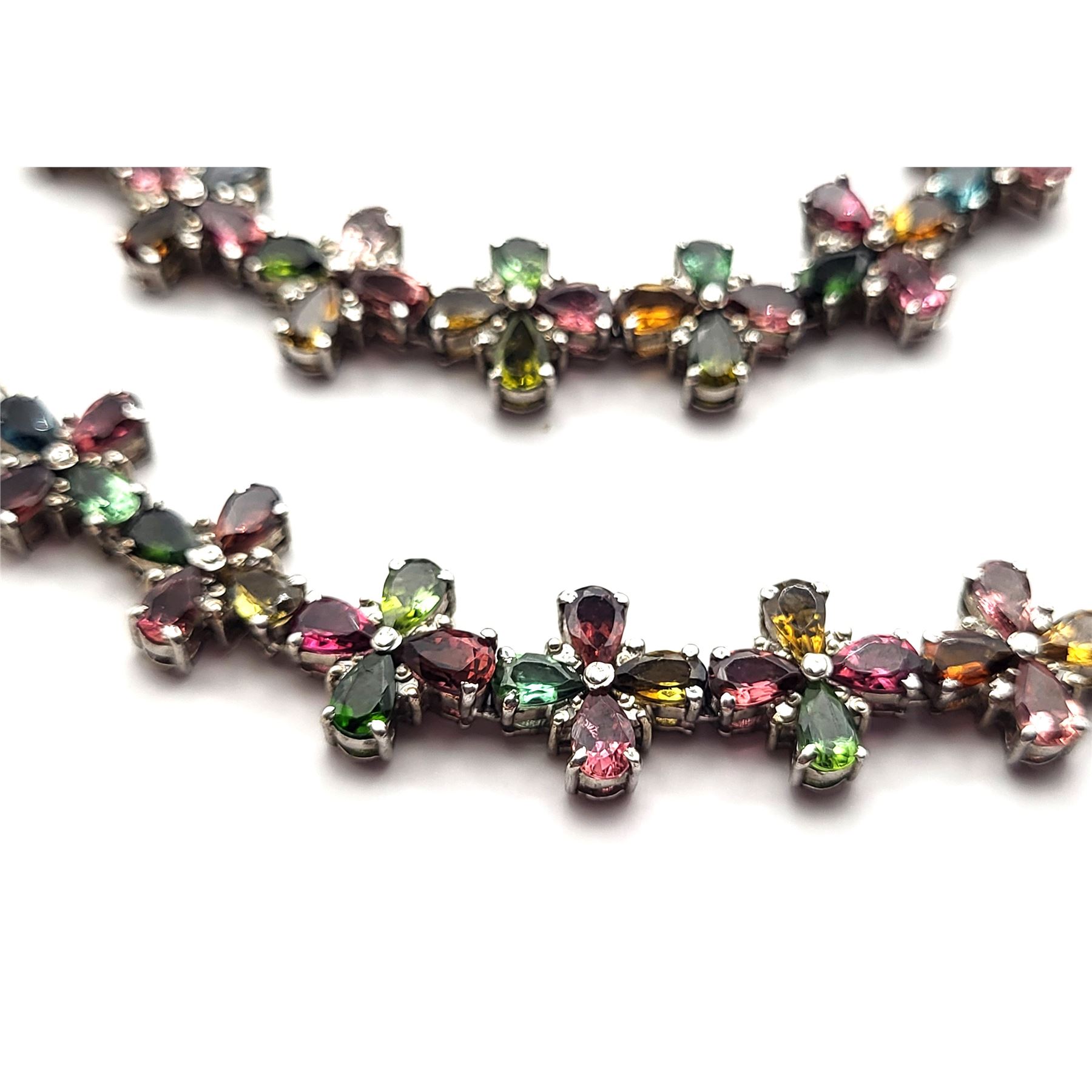 With an incredible range of colors and varieties, it is no wonder that tourmalines are becoming one of the most popular gemstones used by designers today.& nbsp; This incredible necklace is set with over 32.00 carats of pear-cut, prong-set, genuine tourmaline that are arranged in groups of four to resemble colorful flowers 1.92 carats total weight of round, faceted, earth-mined, H-I color, I1-I2 clarity diamonds scattered between the petals, like shiny drops of morning dew.& nbsp; The necklace is 19& quot; to 20& quot; long with the sterling silver extension chain and lobster clasp. Admin: E7159/8-hbh