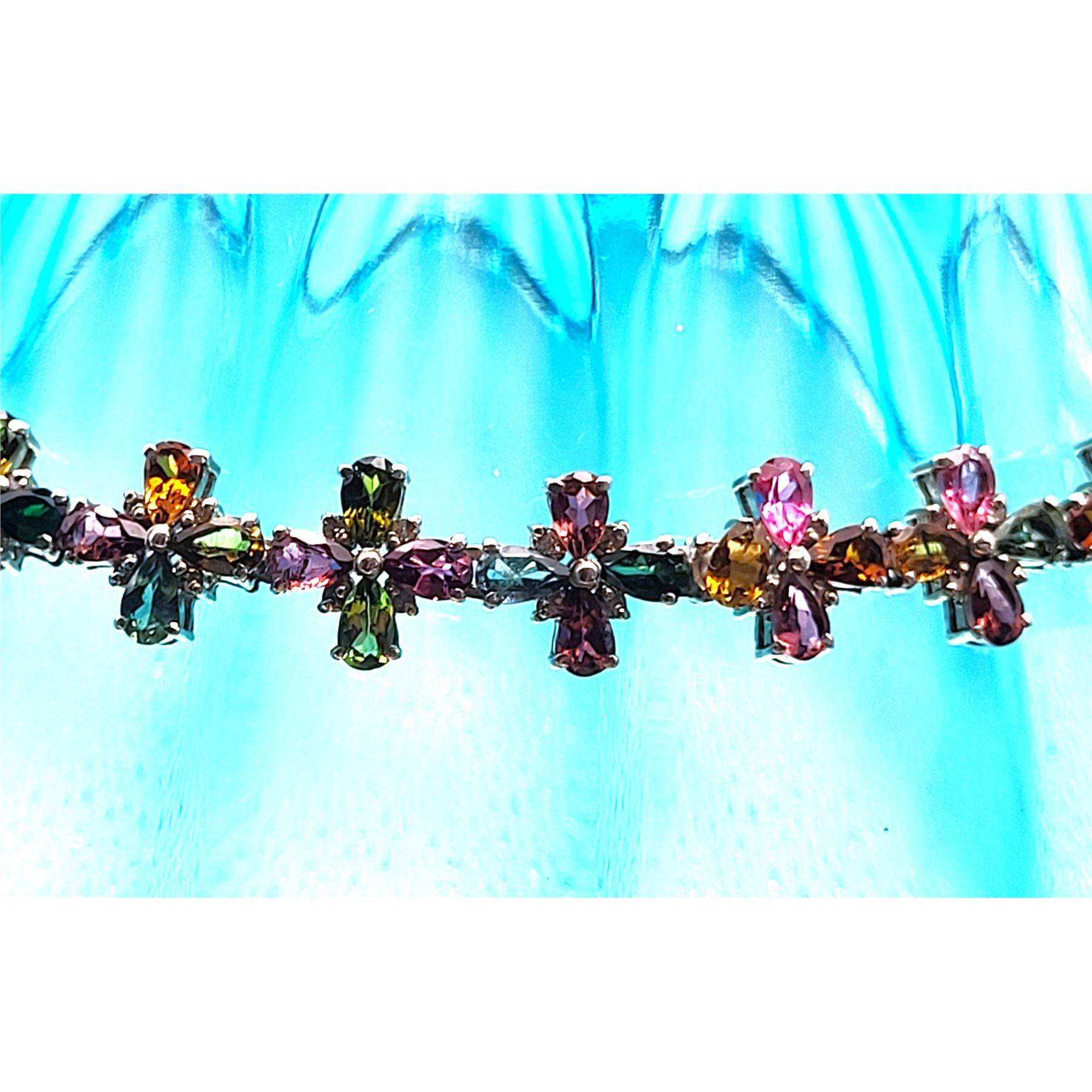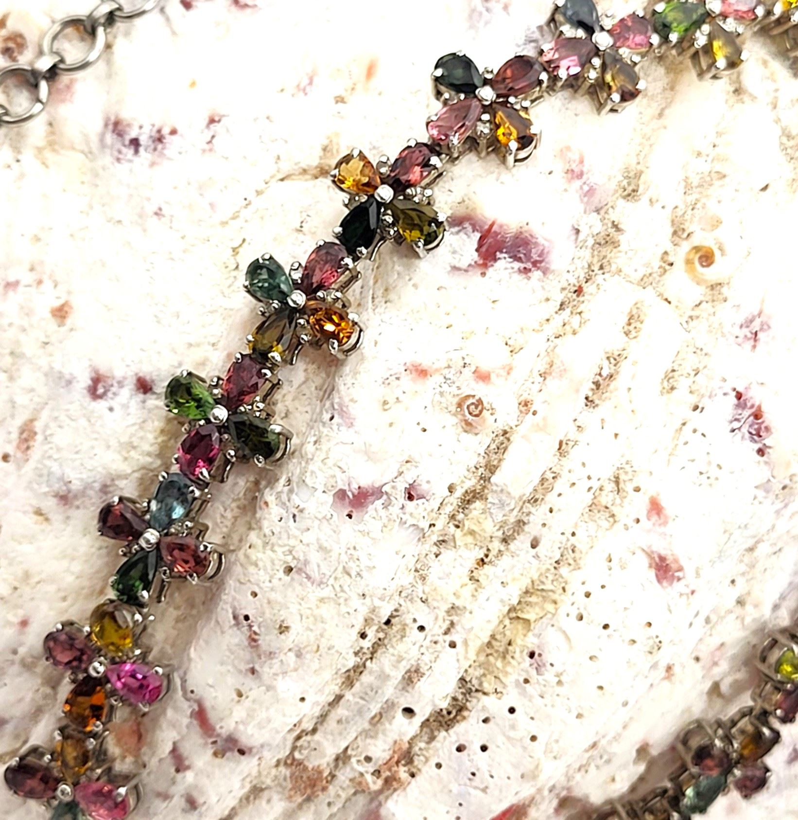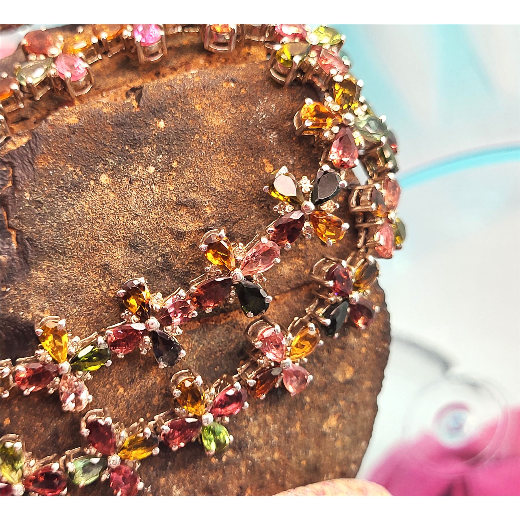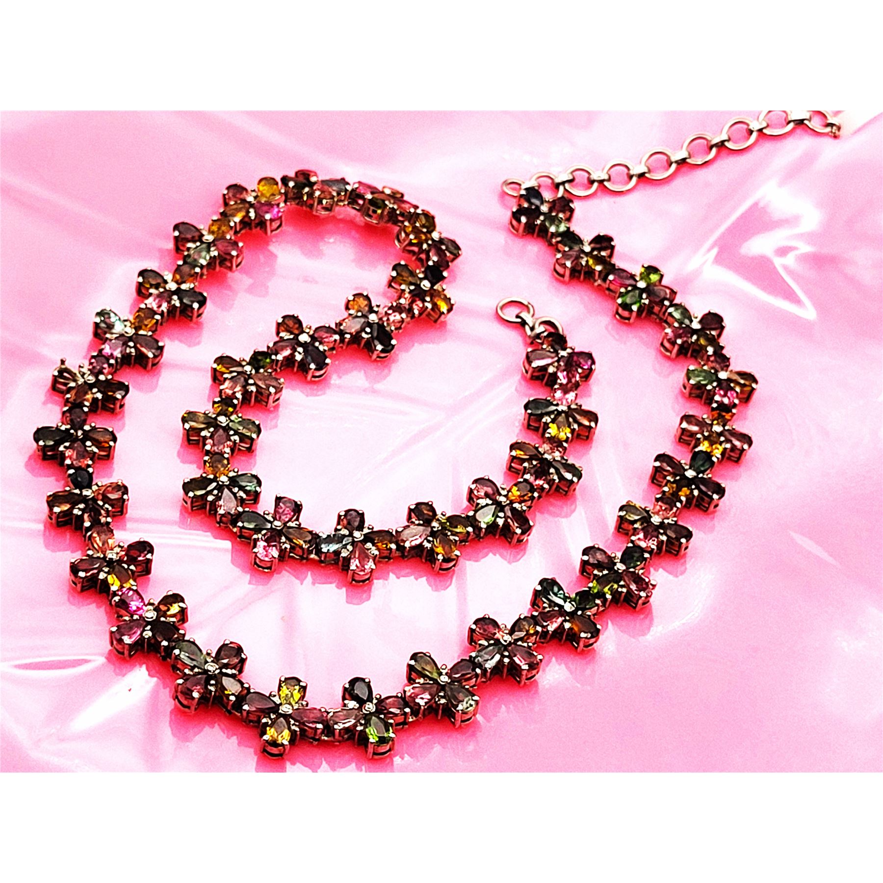 With an incredible range of colors and varieties, it is no wonder that tourmalines are becoming one of the most popular gemstones used by designers today.& nbsp; This incredible necklace is set with over 32.00 carats of pear-cut, prong-set, genuine tourmaline that are arranged in groups of four to resemble colorful flowers 1.92 carats total weight of round, faceted, earth-mined, H-I color, I1-I2 clarity diamonds scattered between the petals, like shiny drops of morning dew.& nbsp; The necklace is 19& quot; to 20& quot; long with the sterling silver extension chain and lobster clasp. Admin: E7159/8-hbh