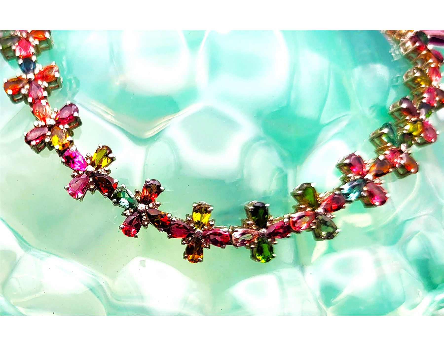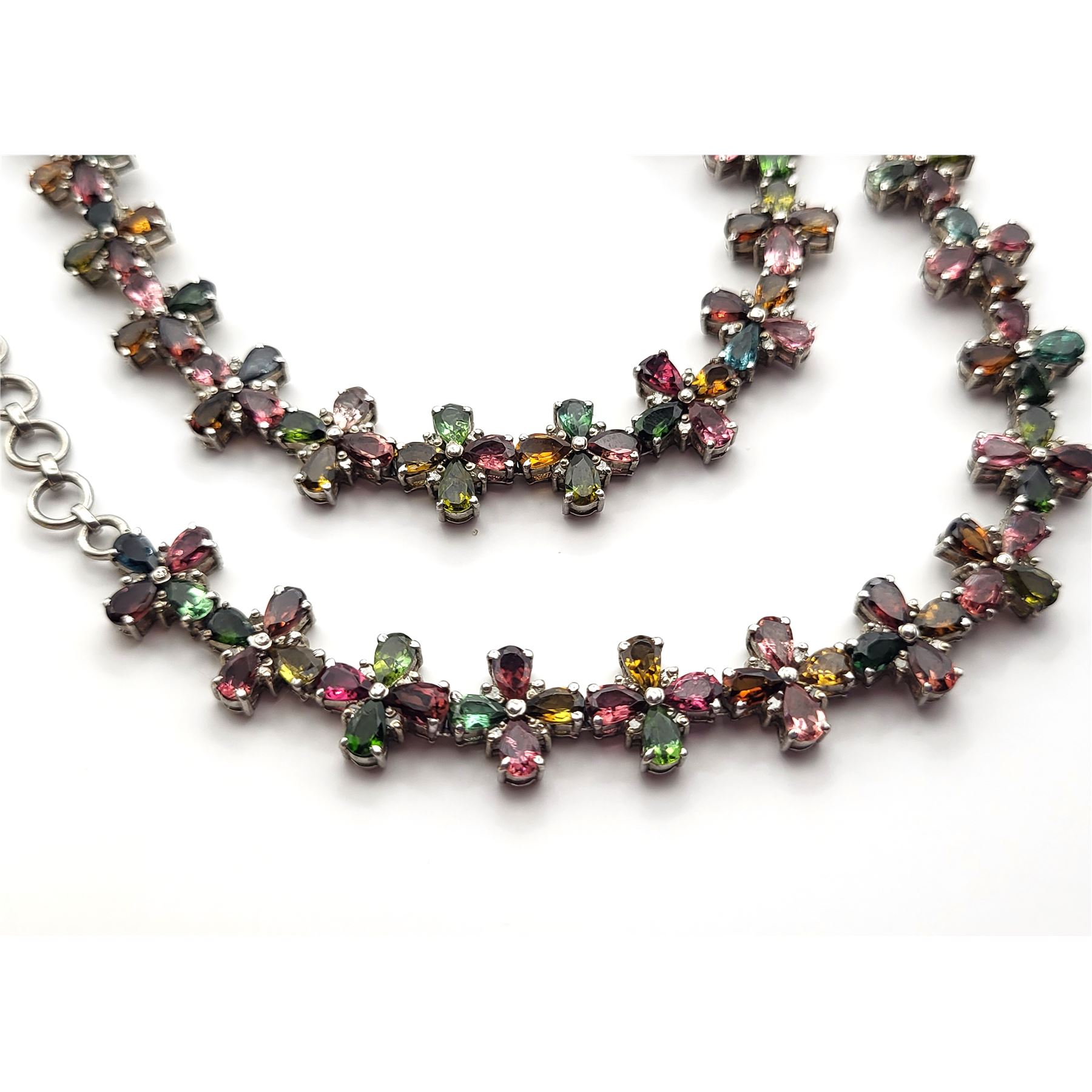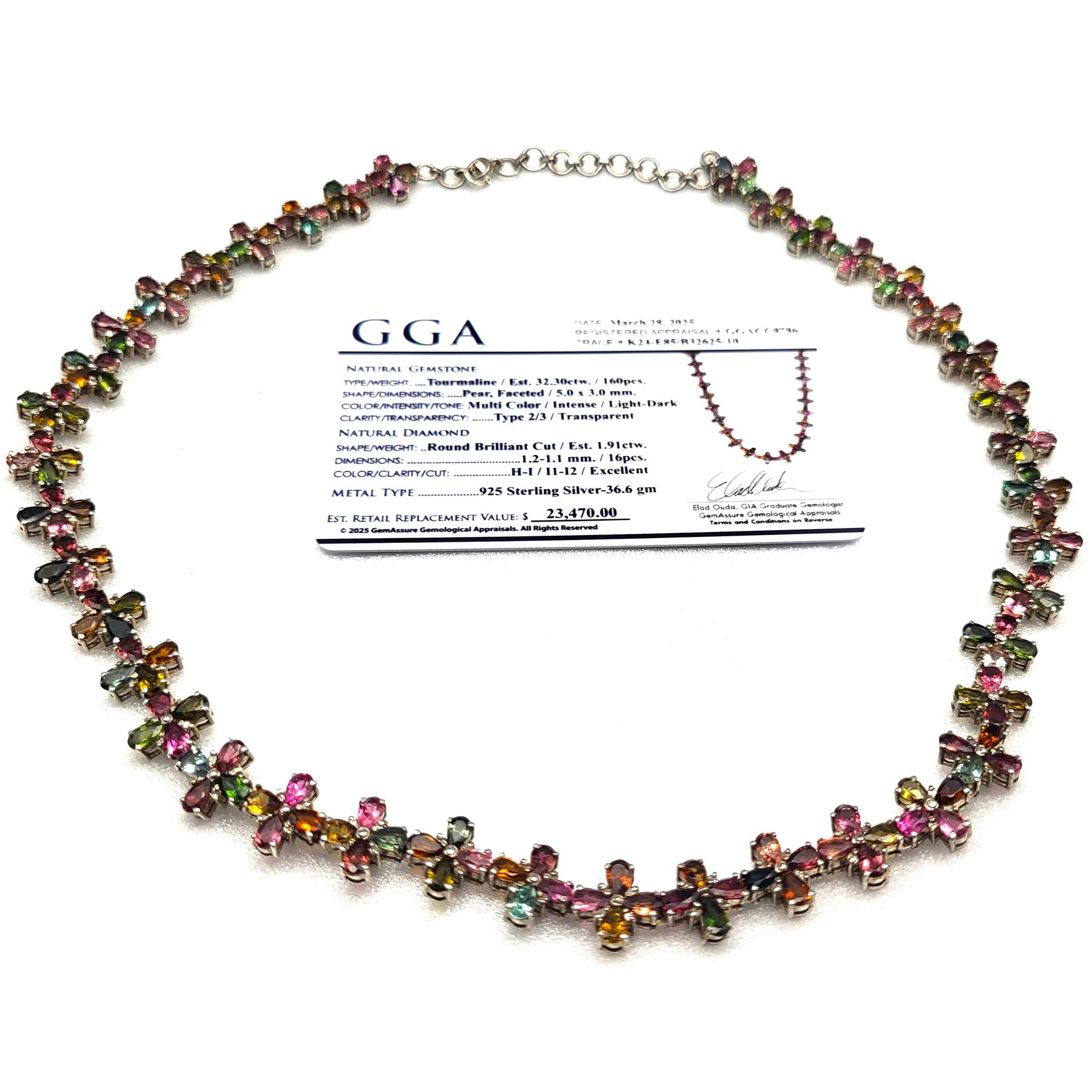 With an incredible range of colors and varieties, it is no wonder that tourmalines are becoming one of the most popular gemstones used by designers today.& nbsp; This incredible necklace is set with over 32.00 carats of pear-cut, prong-set, genuine tourmaline that are arranged in groups of four to resemble colorful flowers 1.92 carats total weight of round, faceted, earth-mined, H-I color, I1-I2 clarity diamonds scattered between the petals, like shiny drops of morning dew.& nbsp; The necklace is 19& quot; to 20& quot; long with the sterling silver extension chain and lobster clasp. Admin: E7159/8-hbh