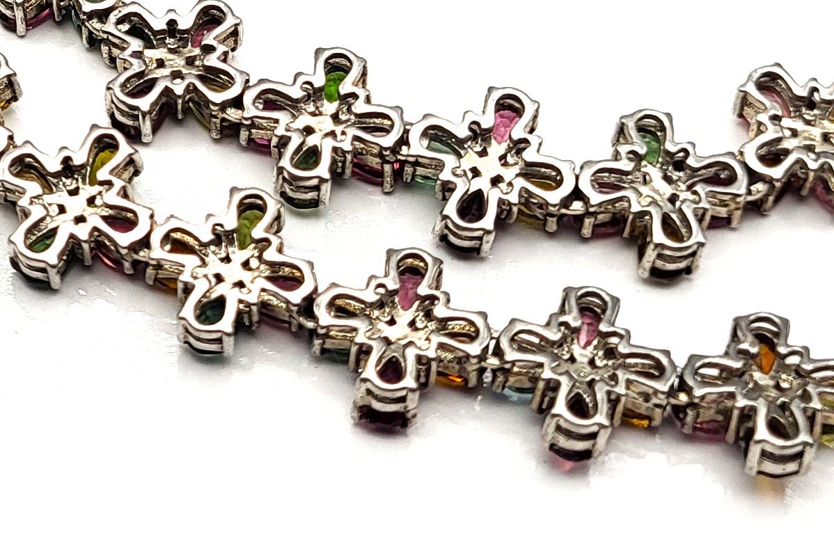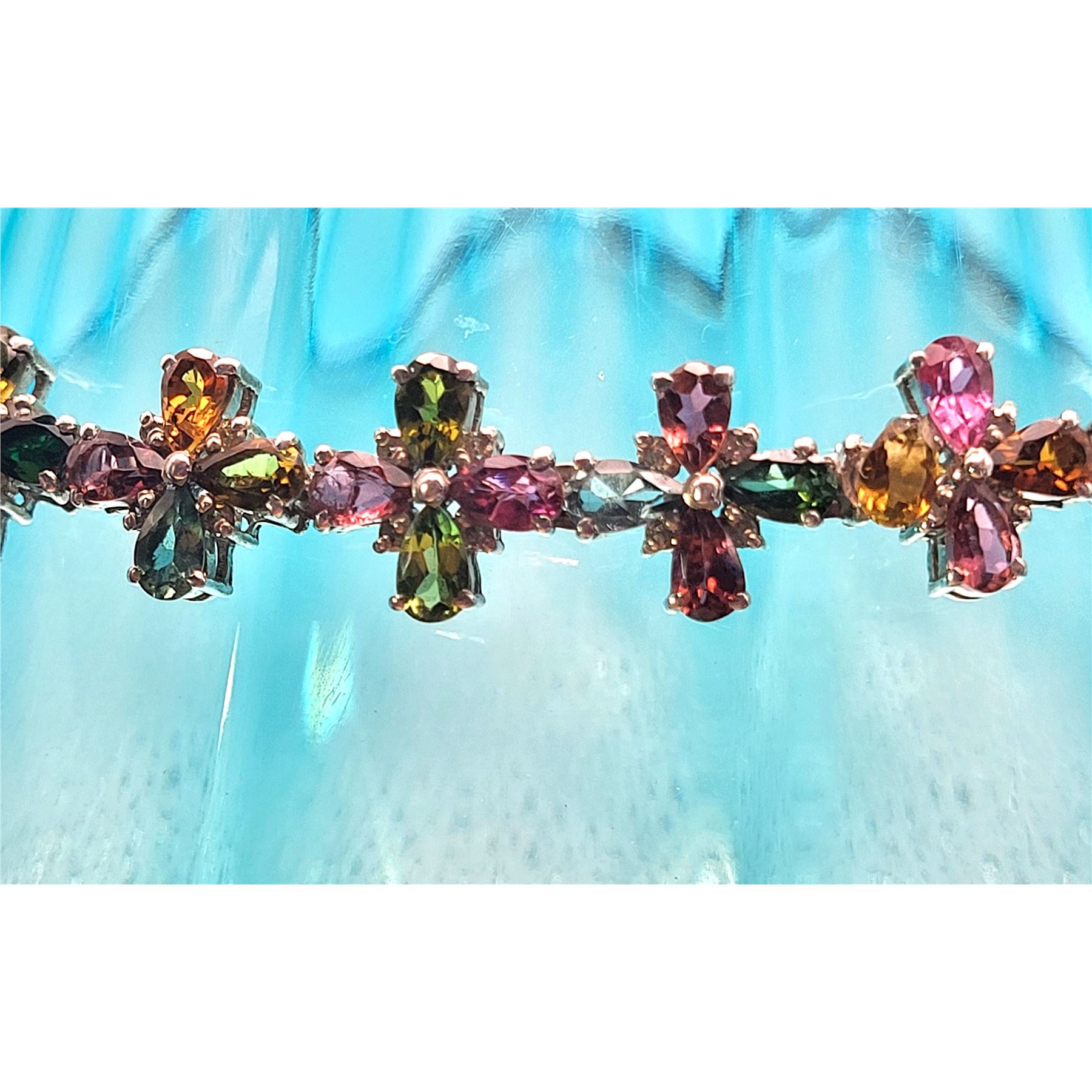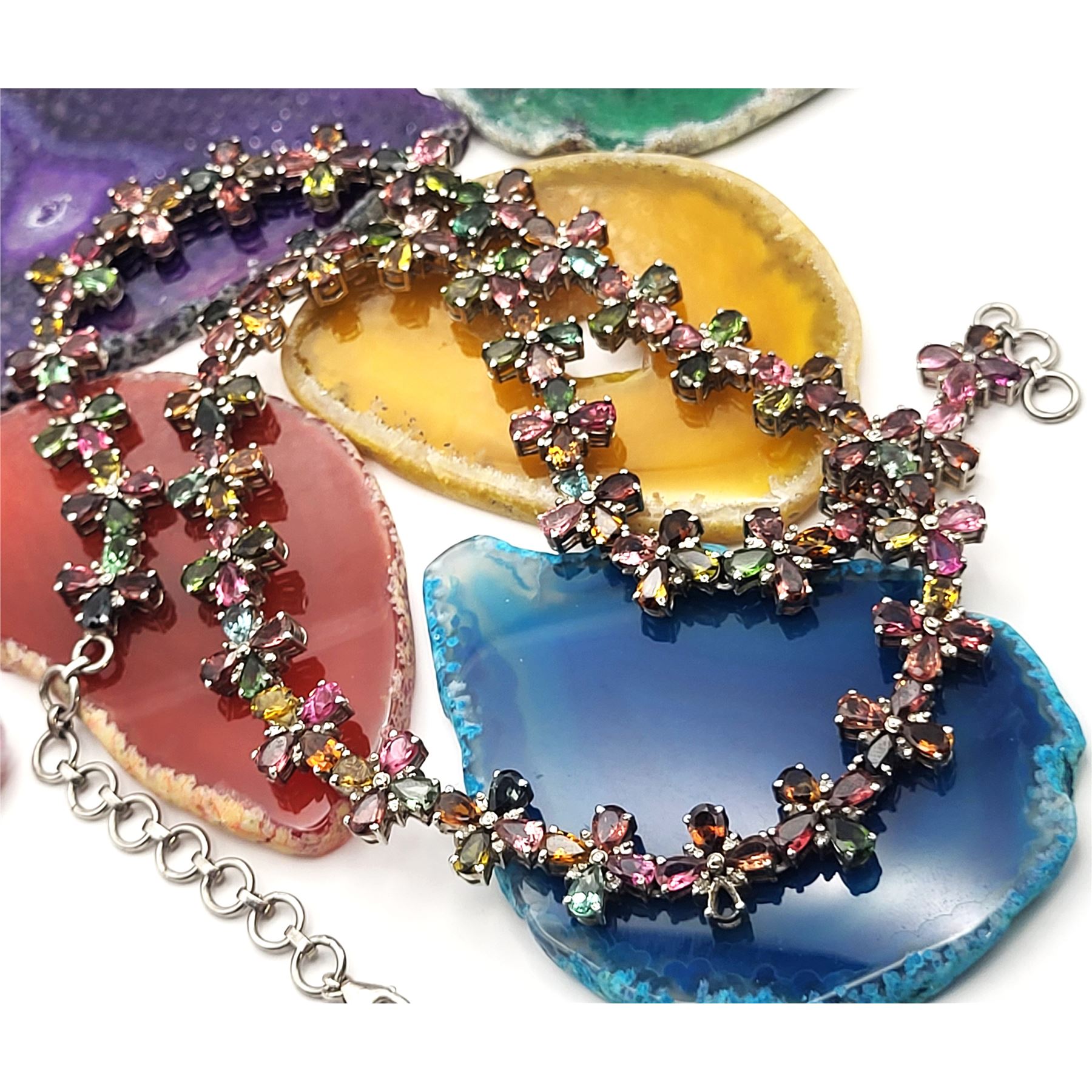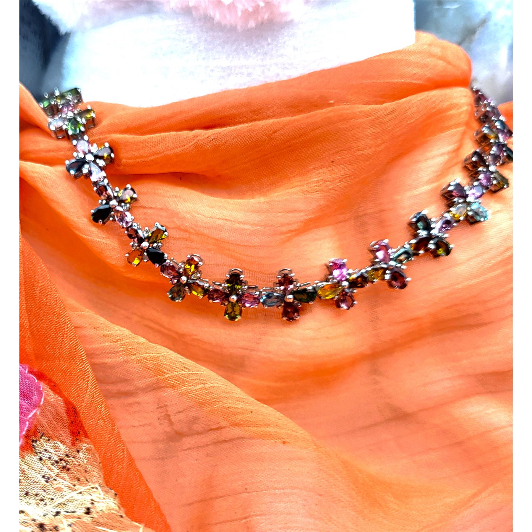 With an incredible range of colors and varieties, it is no wonder that tourmalines are becoming one of the most popular gemstones used by designers today.& nbsp; This incredible necklace is set with over 32.00 carats of pear-cut, prong-set, genuine tourmaline that are arranged in groups of four to resemble colorful flowers 1.92 carats total weight of round, faceted, earth-mined, H-I color, I1-I2 clarity diamonds scattered between the petals, like shiny drops of morning dew.& nbsp; The necklace is 19& quot; to 20& quot; long with the sterling silver extension chain and lobster clasp. Admin: E7159/8-hbh