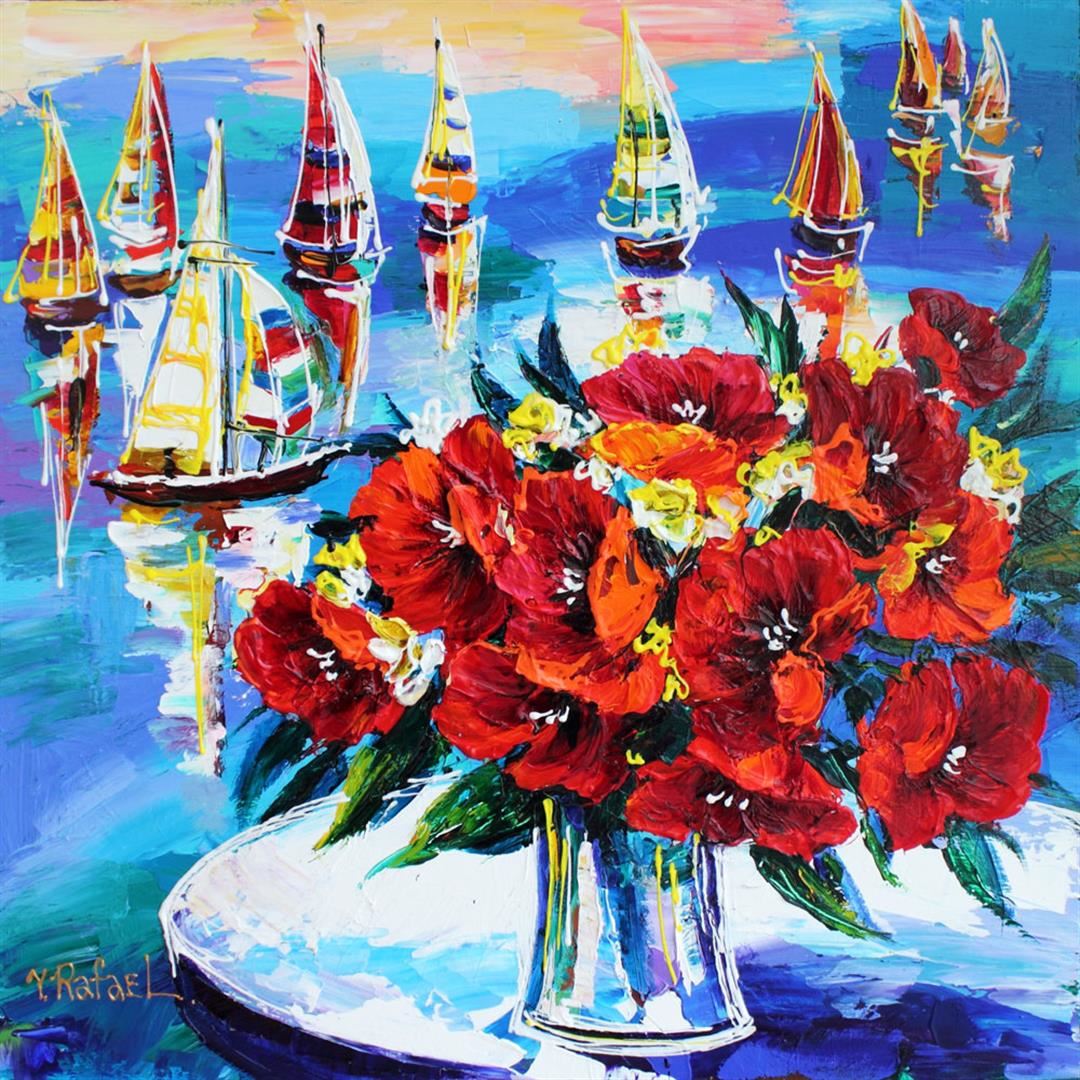Artist: Yana Rafael - Title: Sailboats Outside our Window - Medium: Acrylic on Canvas - Signature: Hand-signed by the artist at the bottom of the image - Image Size: Approximately 24 inches x 24 inches - Stretched and Ready for Framing - Details: This work comes with a Certificate of Authenticity - Yana Rafael's style is full of vibrant colors and expresses emotions typically associated with bold life. When violent colors are next to each other they trick the eye into a sensation of movement.